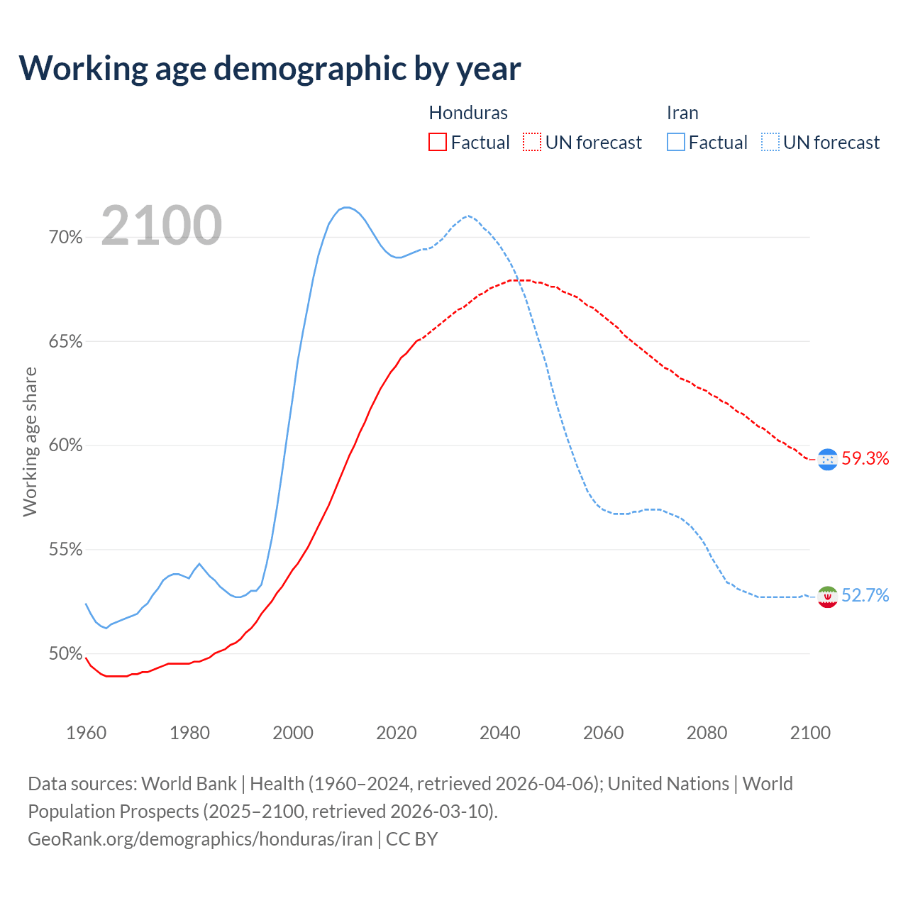 Median age Honduras vs Iran, 1960-2100