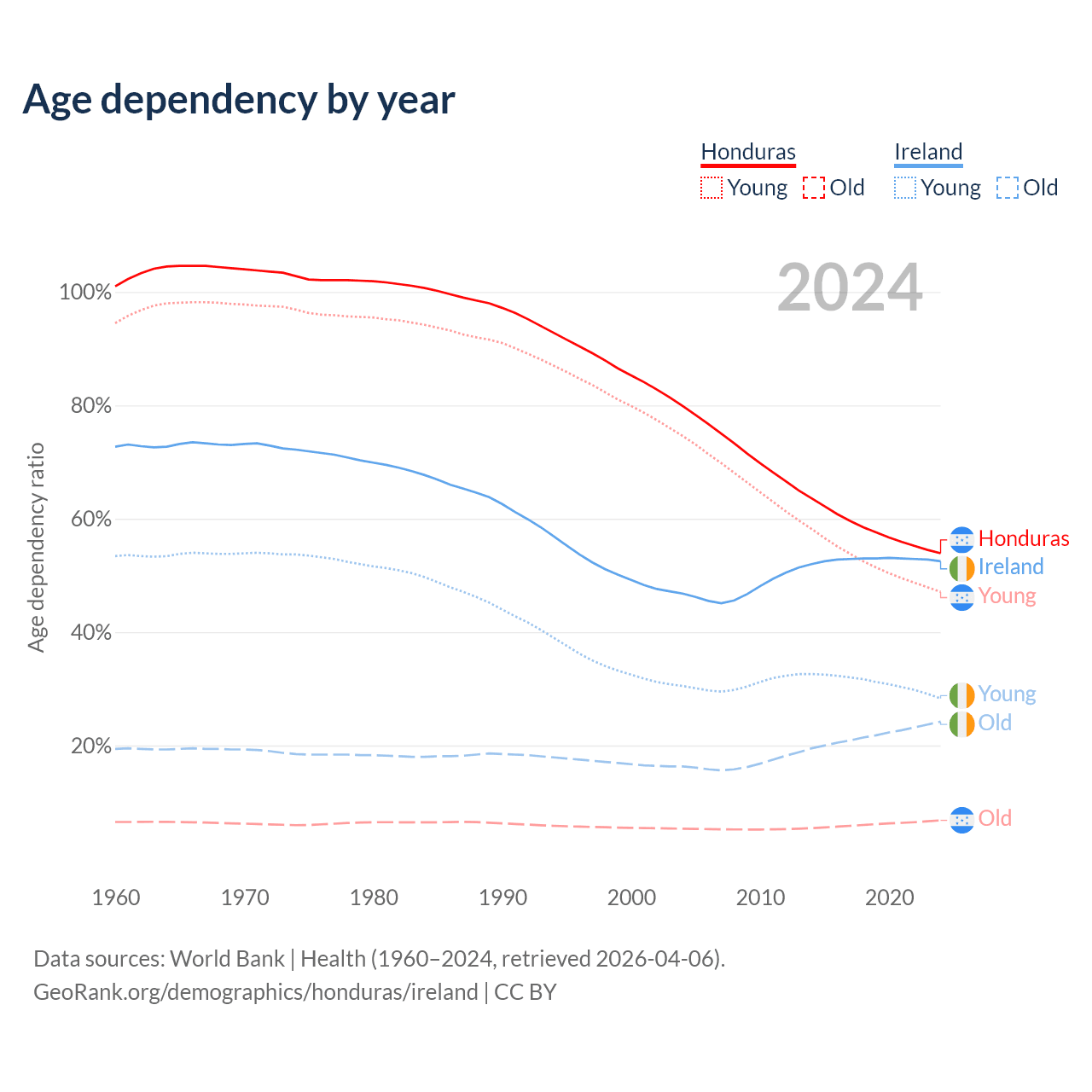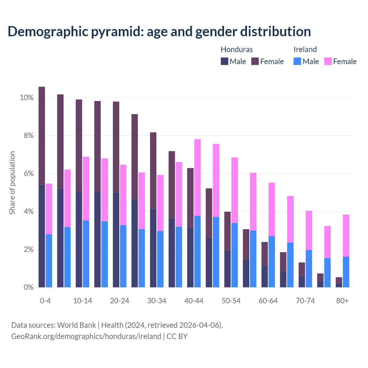 - The share of old-age demographic (65+) in Honduras is 4.42% vs 15.9% in Ireland.