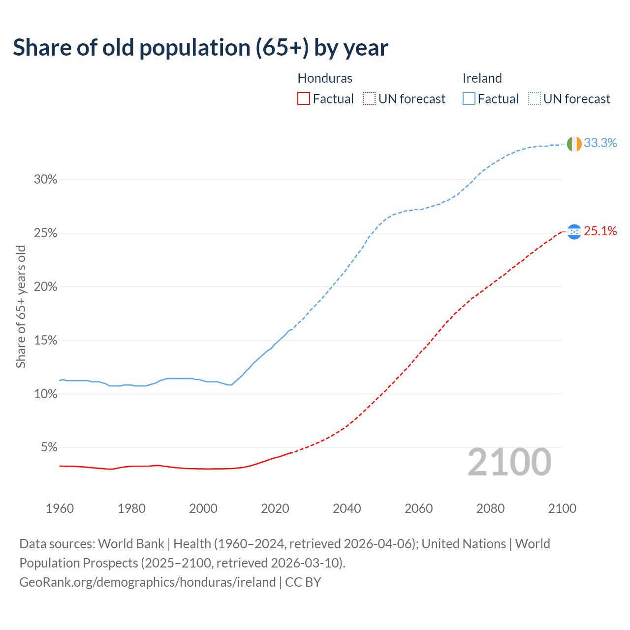 The share of older people aged 65 and over is 4.42% in Honduras and 15.9% in Ireland. Life expectancy in Honduras compared to Ireland .