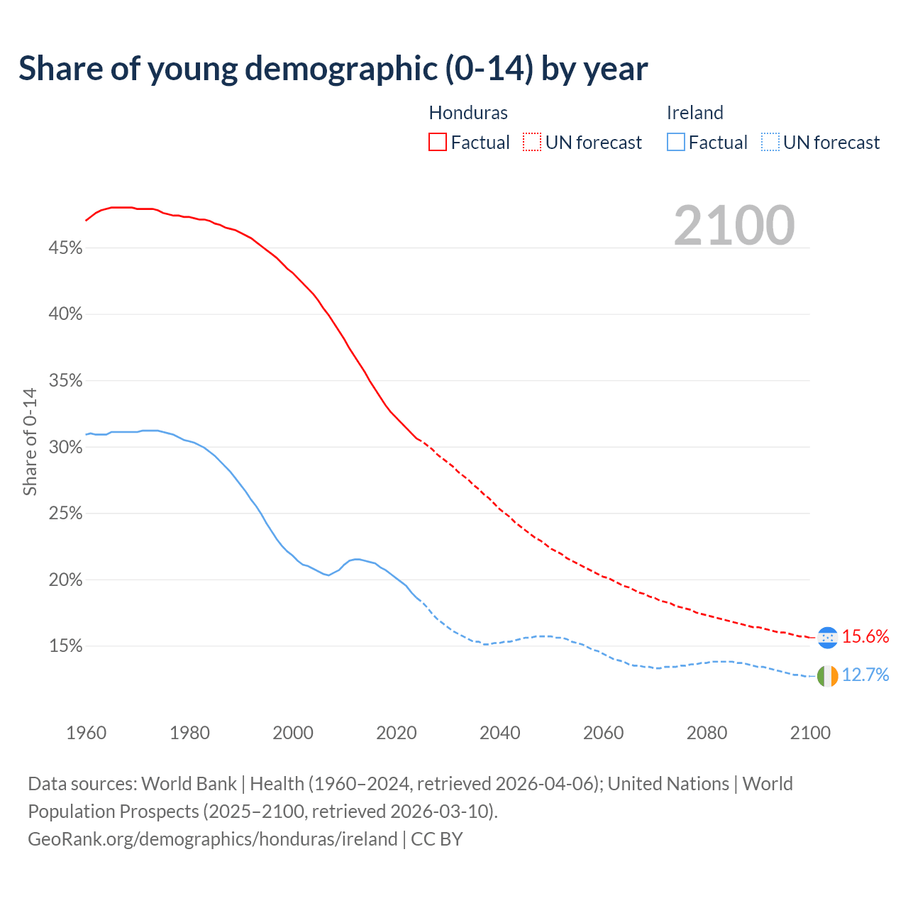 - The share of young demographic (0-15 years old) in Honduras is 30.6% vs 18.6% in Ireland.