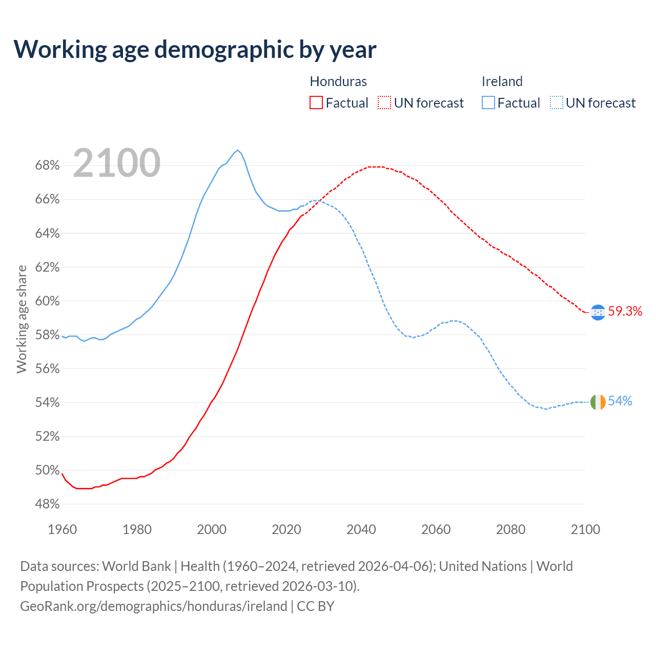 Median age Honduras vs Ireland, 1960-2100