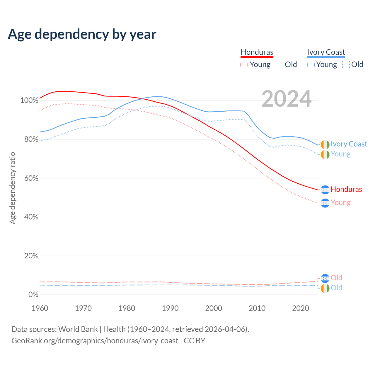 - Honduras is ranked 134/196 by median age (oldest to youngest) vs 175/196 for Ivory Coast.