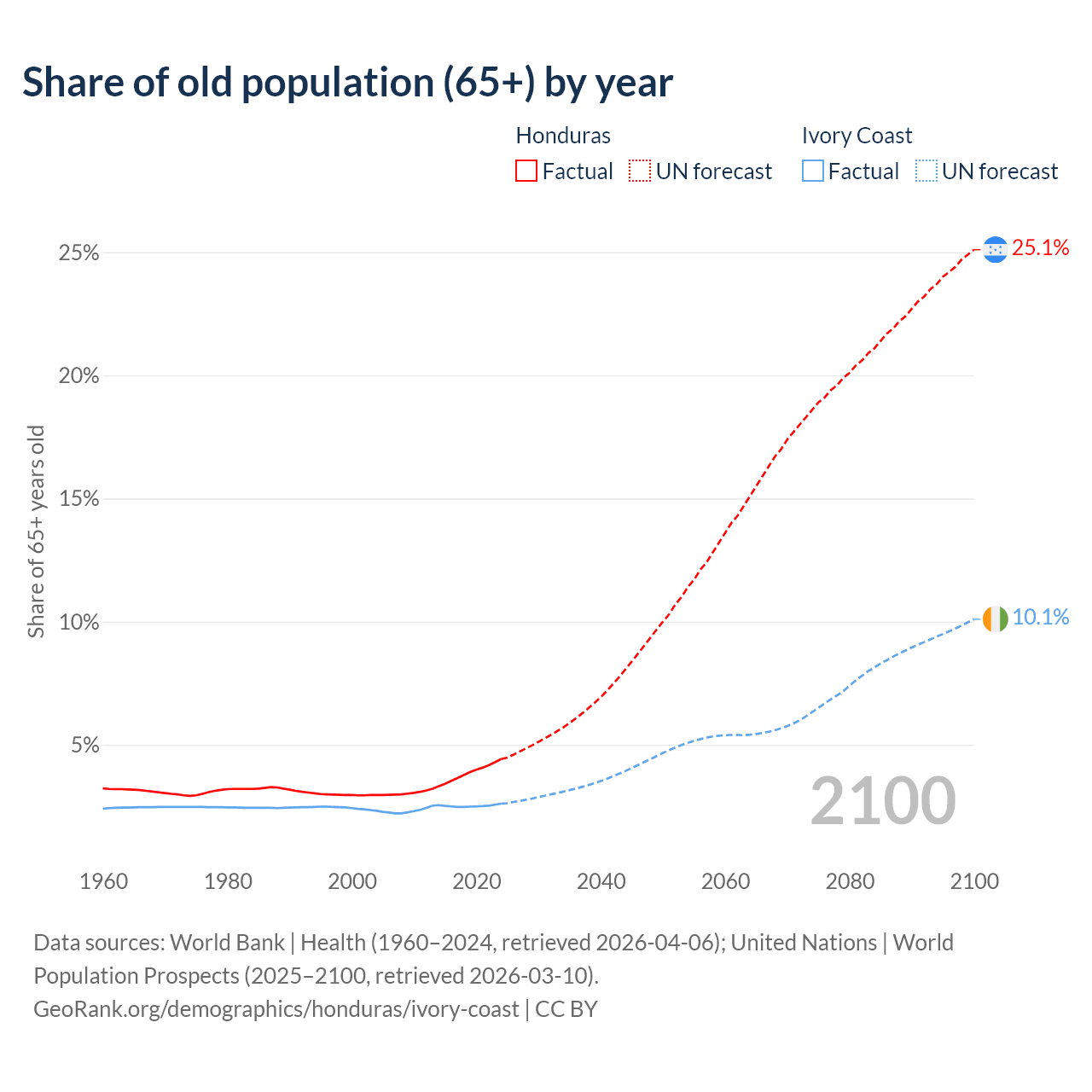 - The share of old-age demographic (65+) in Honduras is 4.42% vs 2.61% in Ivory Coast.