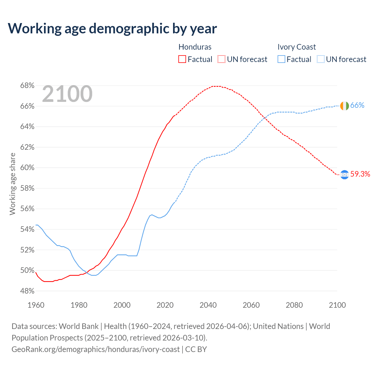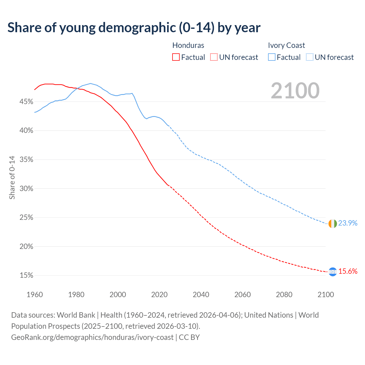 - As of 2026, the population of Honduras is 11.2M vs 33.7M in Ivory Coast - 3 times difference.