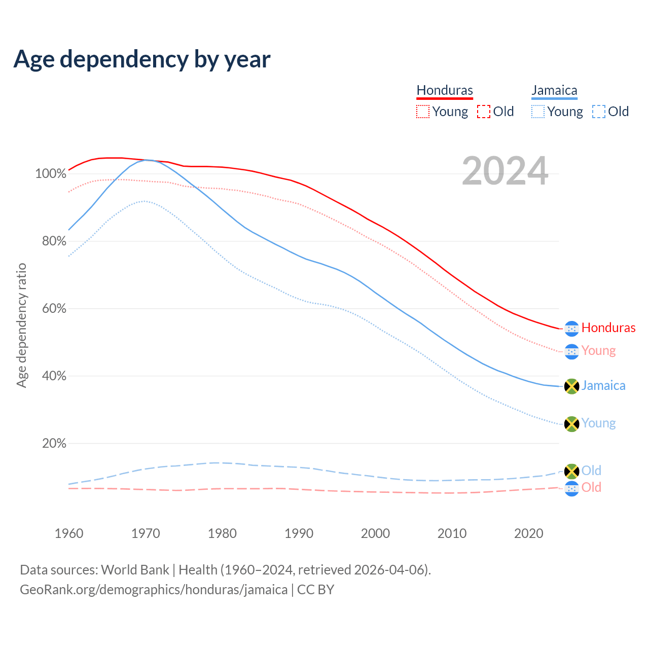 Data sources: World Bank | Health (1960–2024, retrieved 2026-04-06); U.S. Census Bureau (1960–2024, retrieved 2026-02-08).