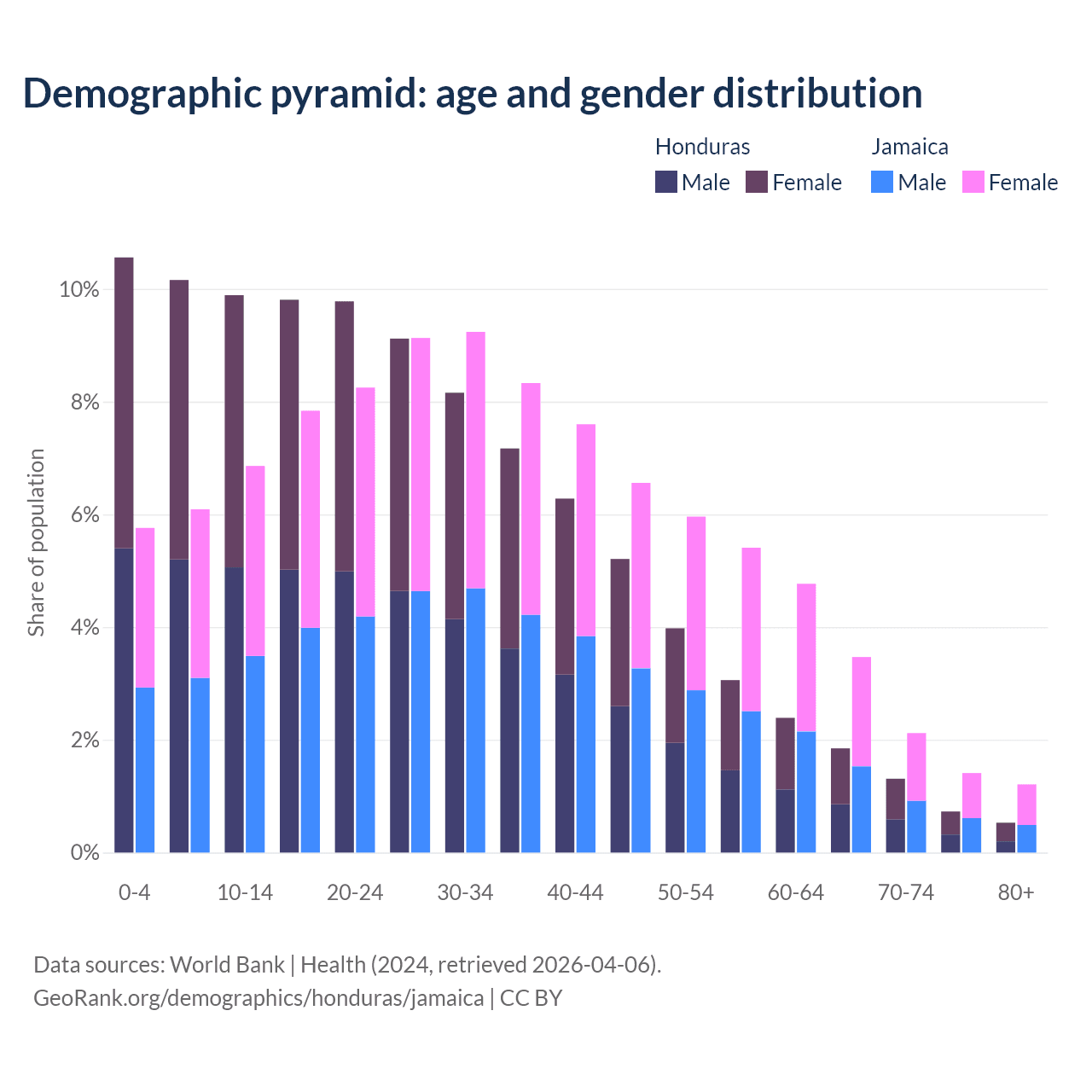 - The share of young demographic (0-15 years old) in Honduras is 30.6% vs 18.7% in Jamaica.