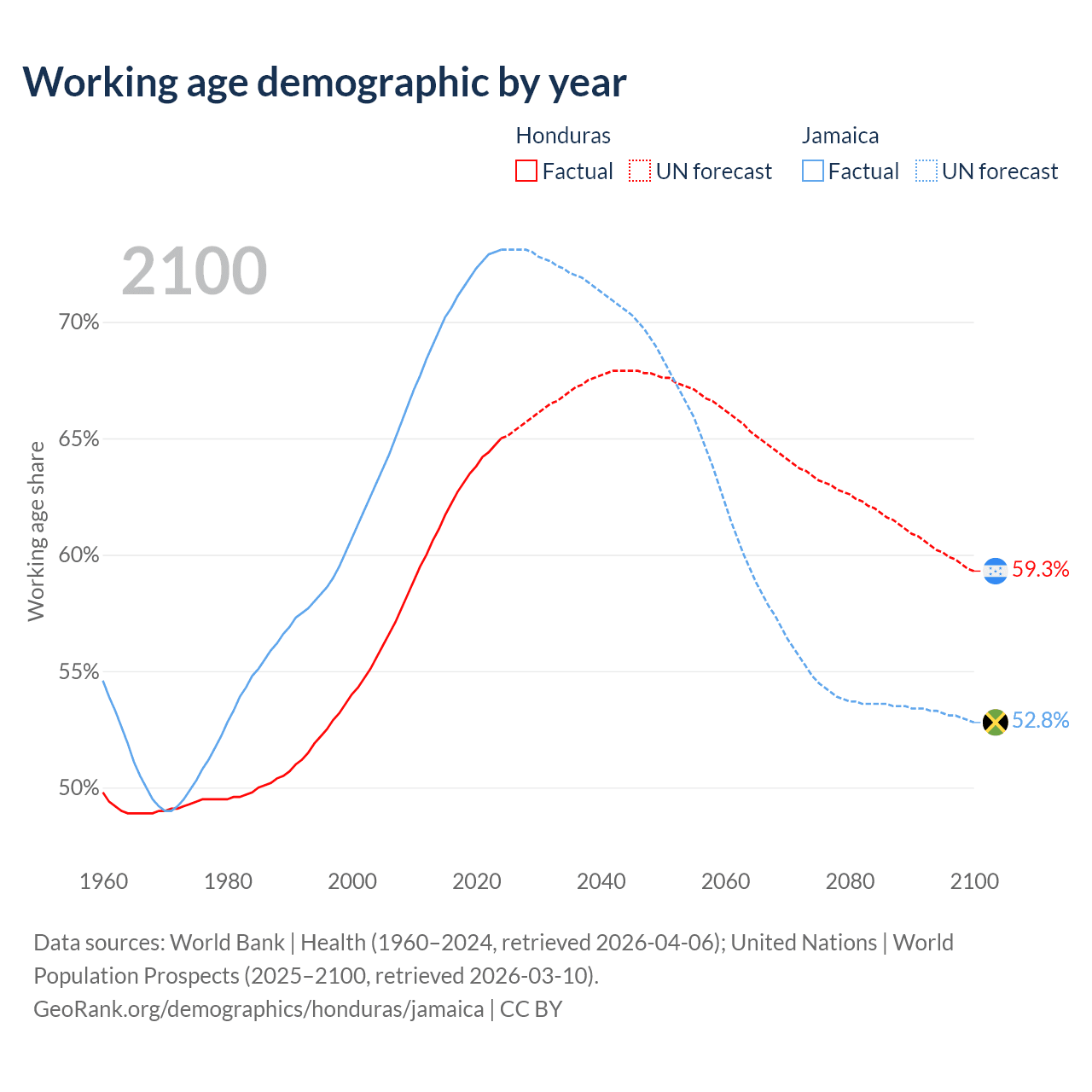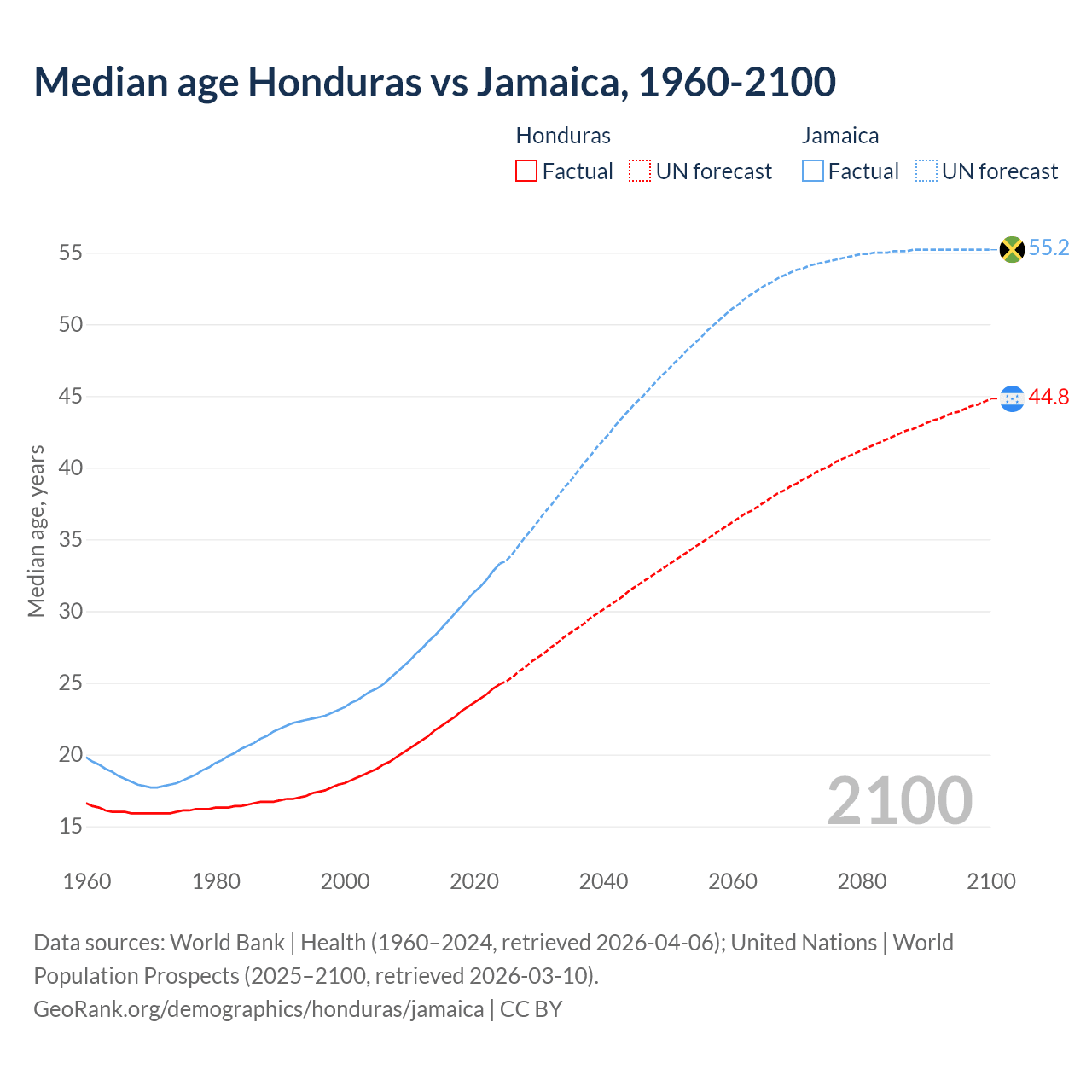 Median age Honduras vs Jamaica, 1960-2100