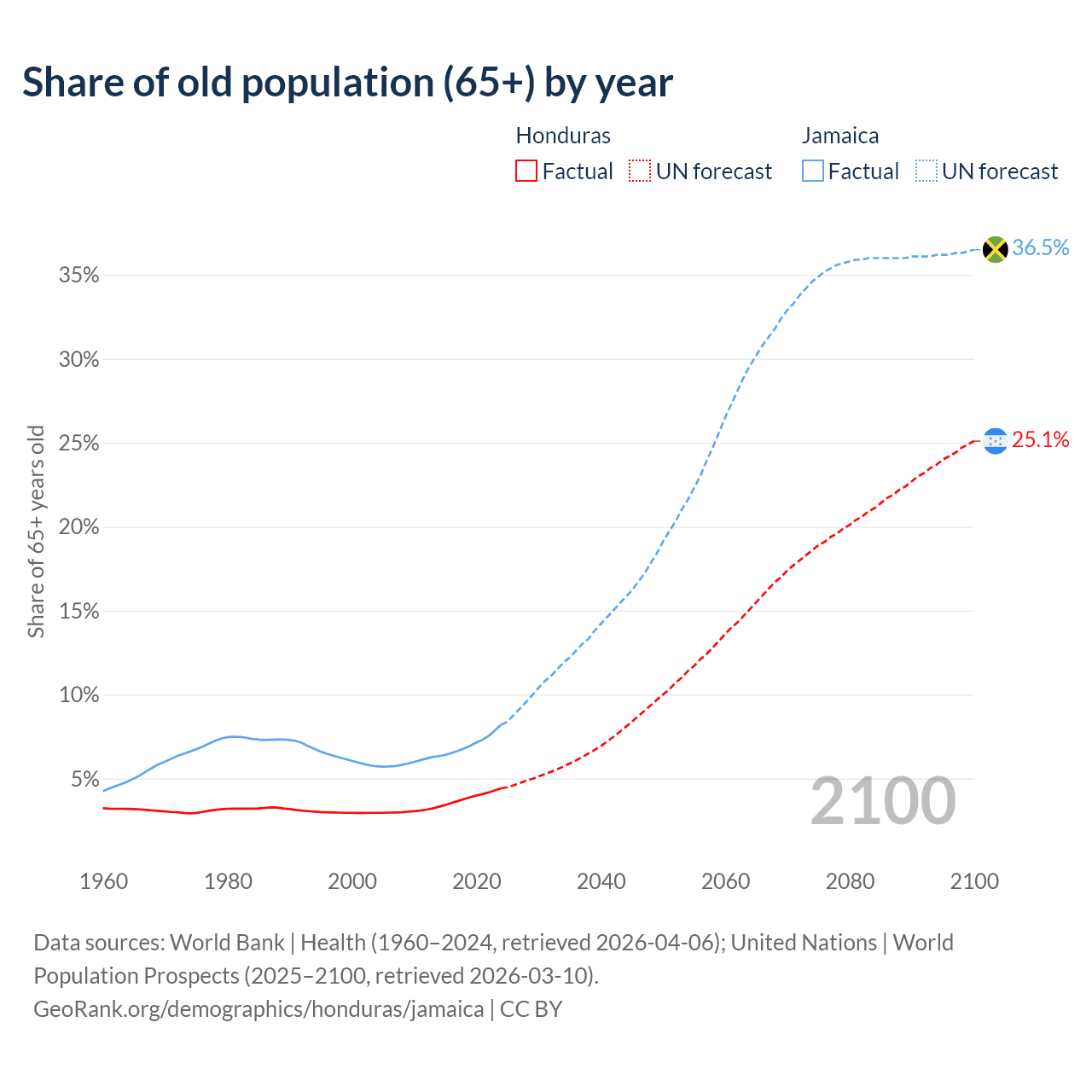 The share of older people aged 65 and over is 4.42% in Honduras and 8.21% in Jamaica. Life expectancy in Honduras compared to Jamaica .
