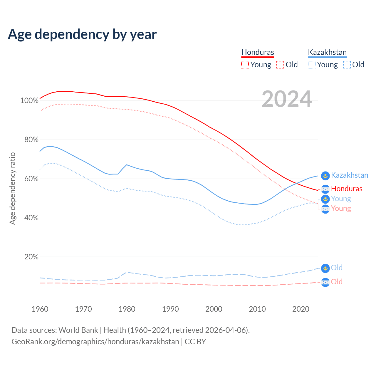 Data sources: World Bank | Health (1960–2024, retrieved 2026-04-06); U.S. Census Bureau (1960–2024, retrieved 2026-02-08).