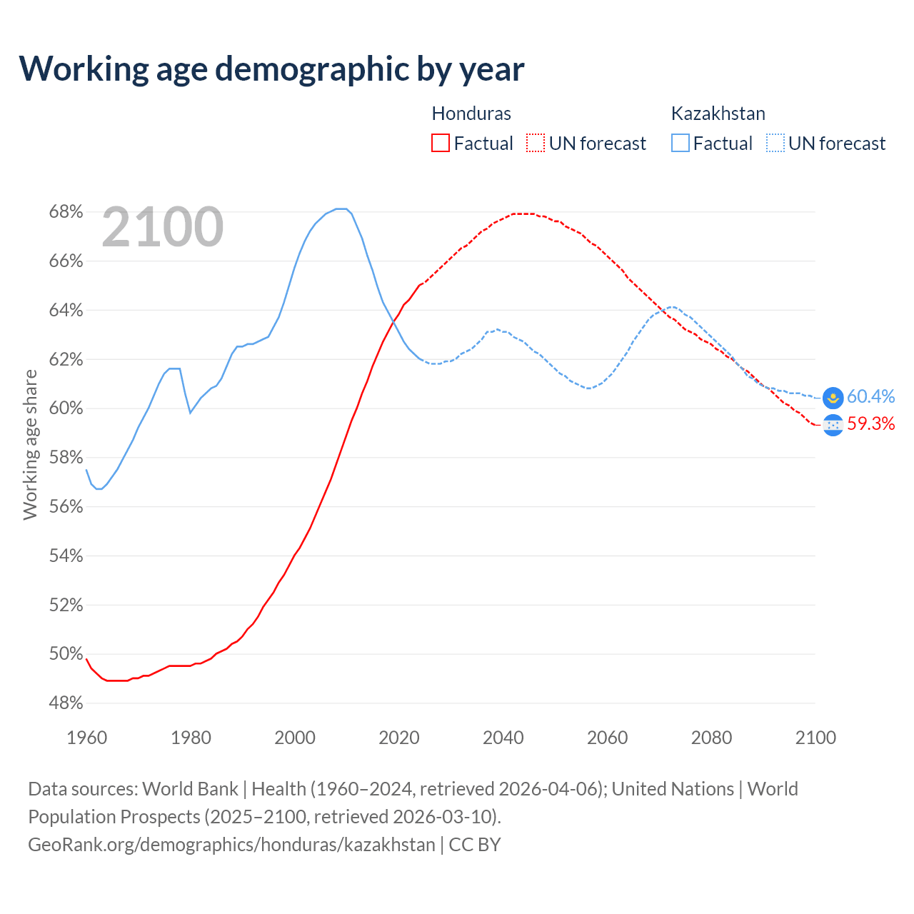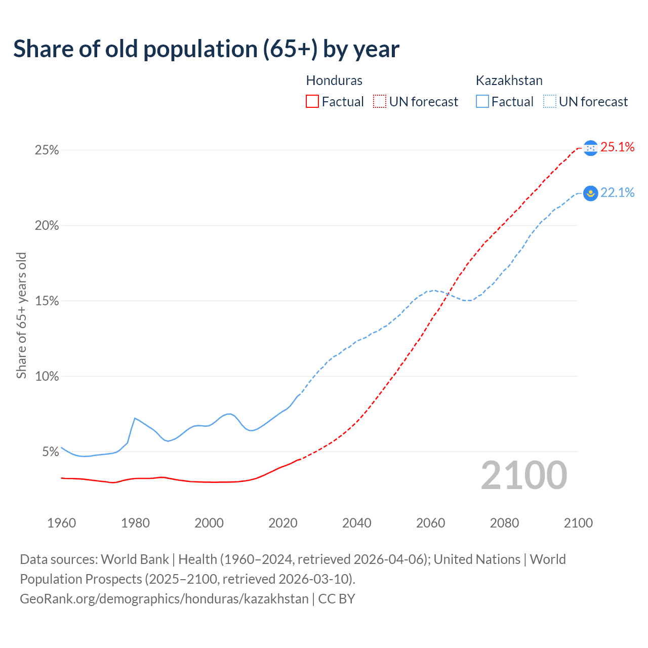 Median age Honduras vs Kazakhstan, 1960-2100