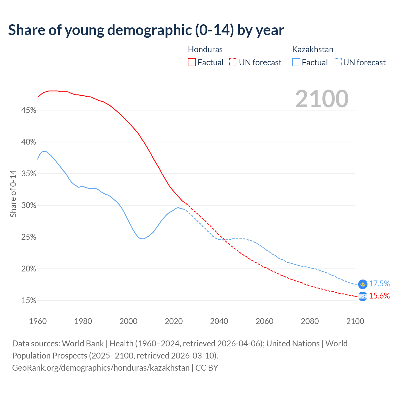 - The share of young demographic (0-15 years old) in Honduras is 30.6% vs 29.4% in Kazakhstan.