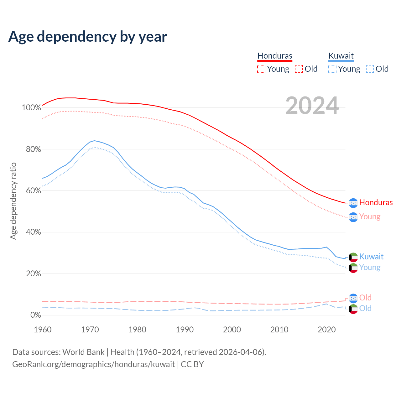 Data sources: World Bank | Health (1960–2024, retrieved 2026-04-06); U.S. Census Bureau (1960–2024, retrieved 2026-02-08).
