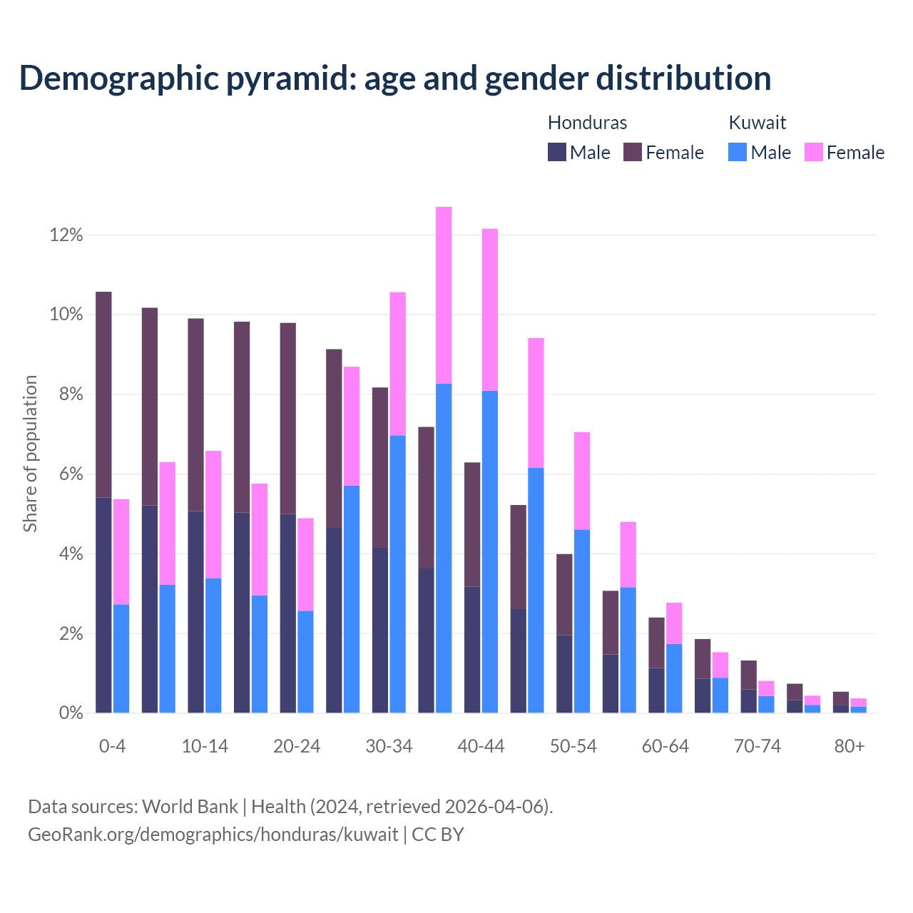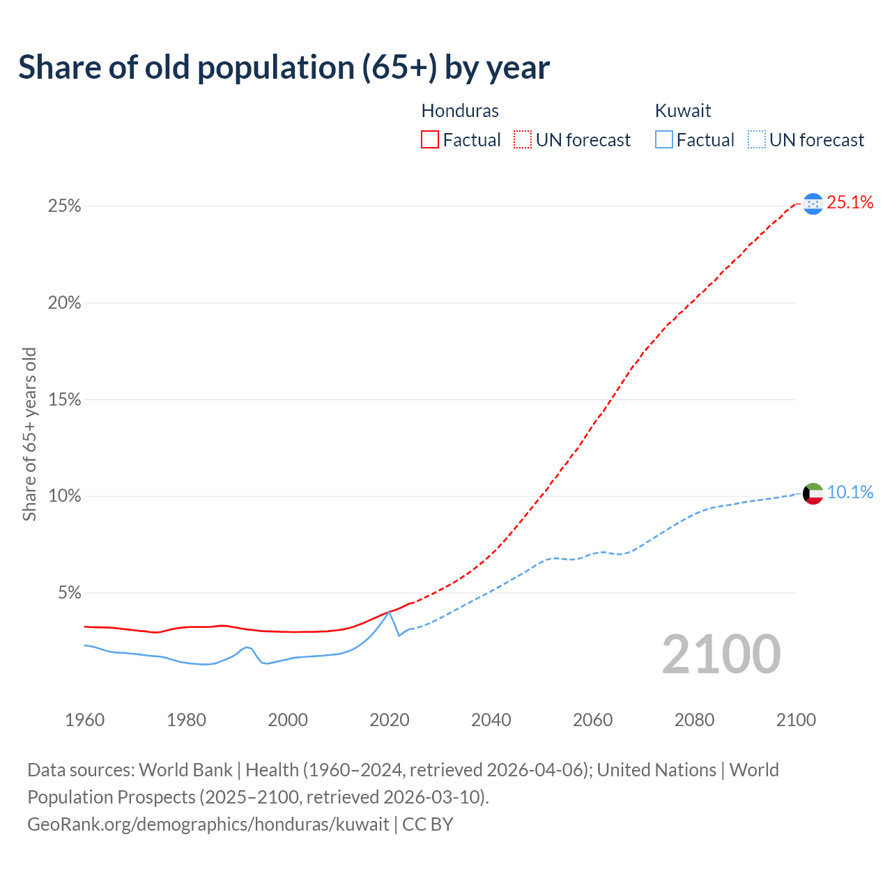 - The share of old-age demographic (65+) in Honduras is 4.42% vs 3.1% in Kuwait.