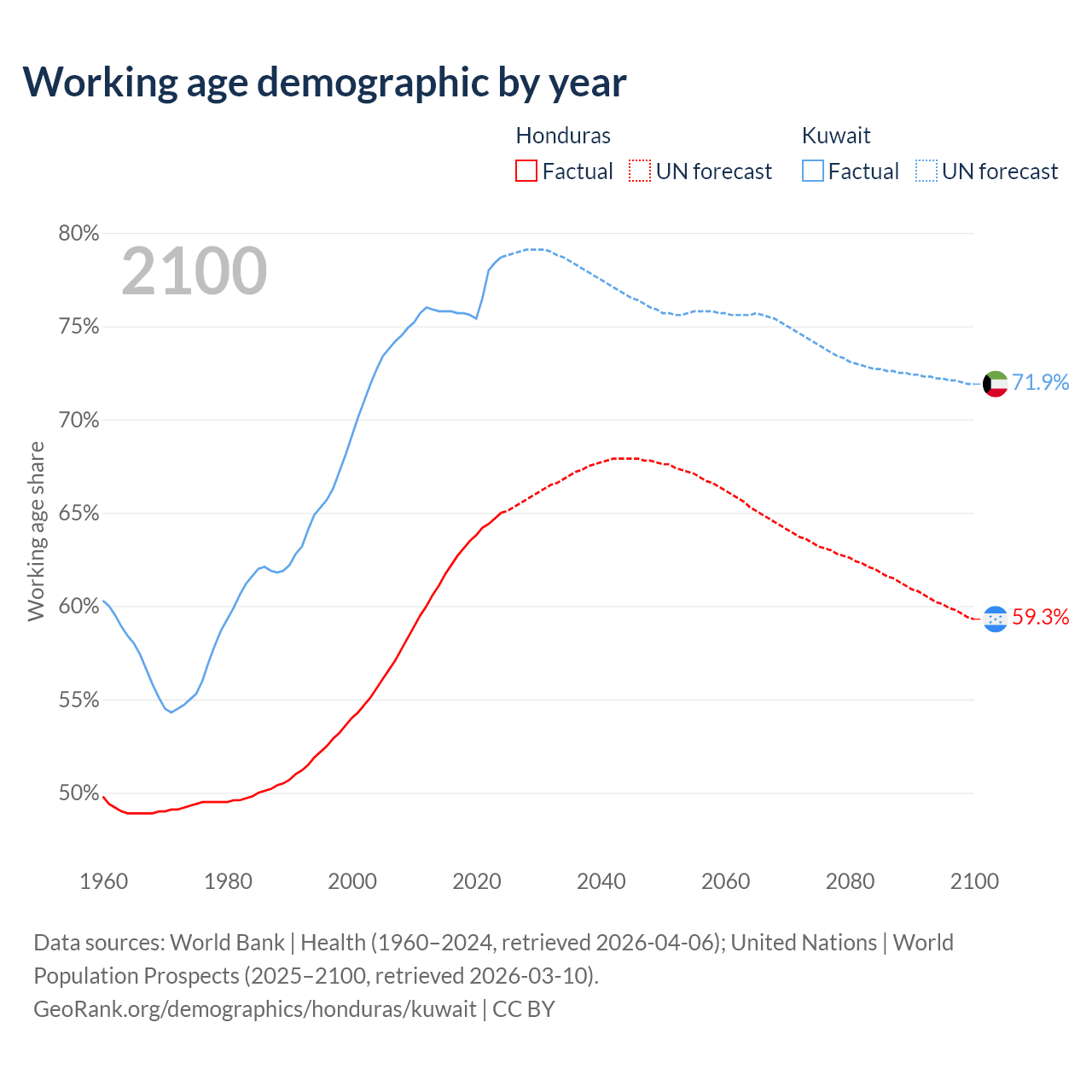 Median age Honduras vs Kuwait, 1960-2100