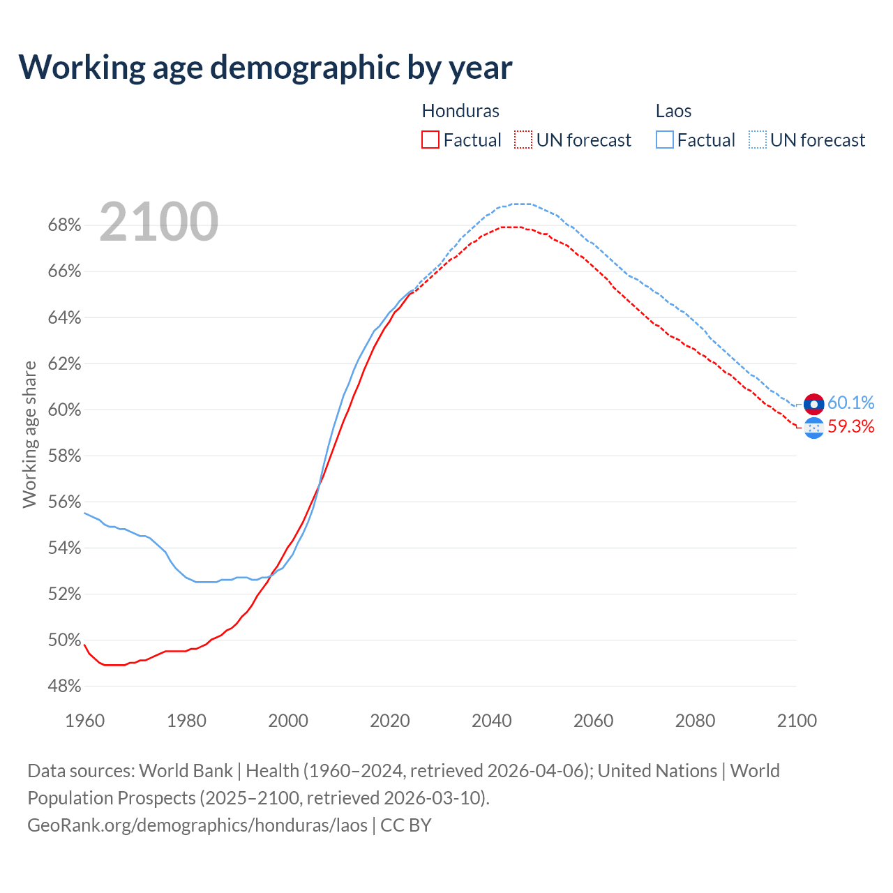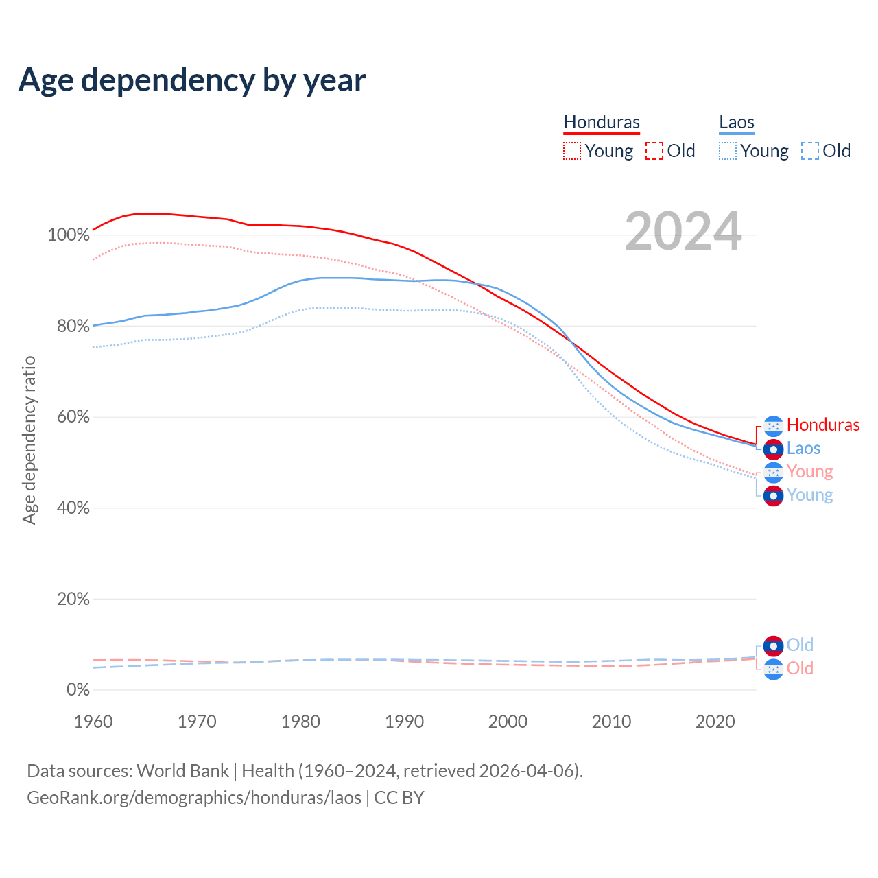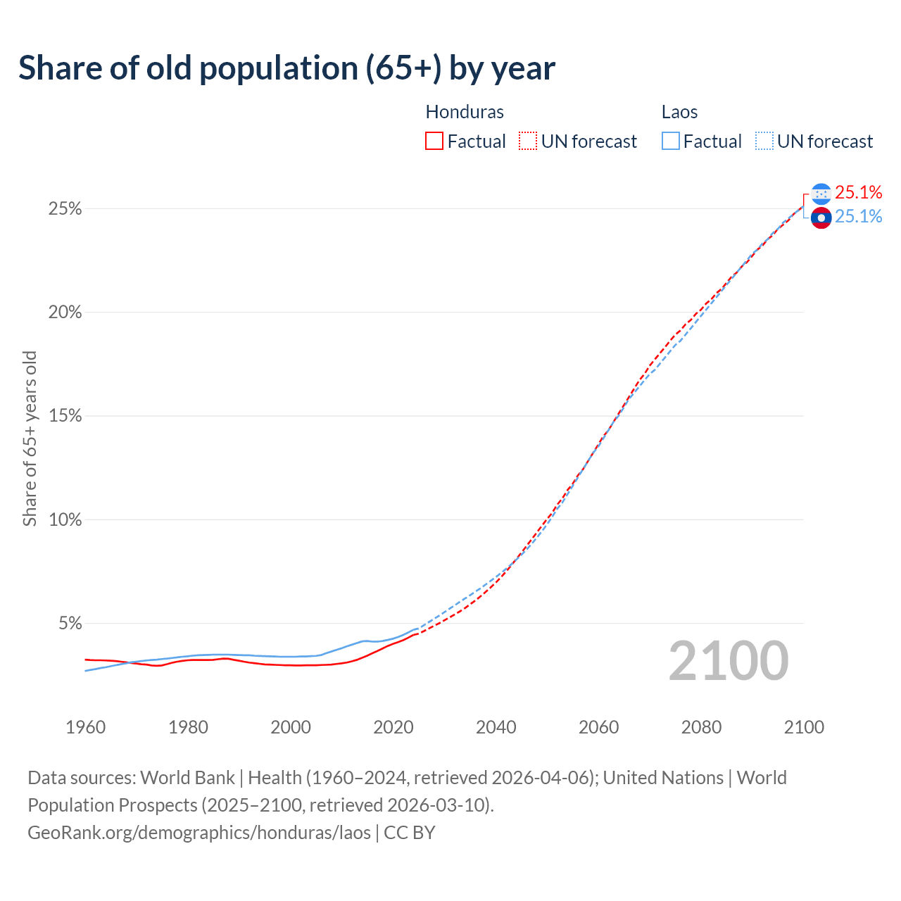 - The share of old-age demographic (65+) in Honduras is 4.42% vs 4.67% in Laos.