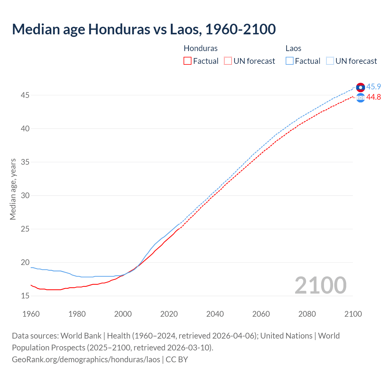 - Honduras is ranked 134/196 by median age (oldest to youngest) vs 130/196 for Laos.
