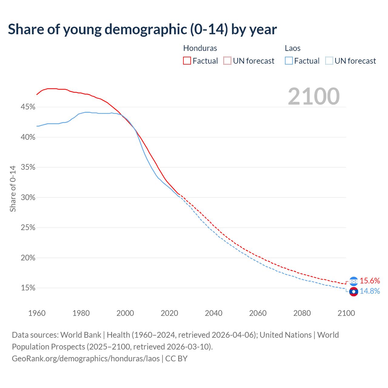 - The share of young demographic (0-15 years old) in Honduras is 30.6% vs 30.2% in Laos.