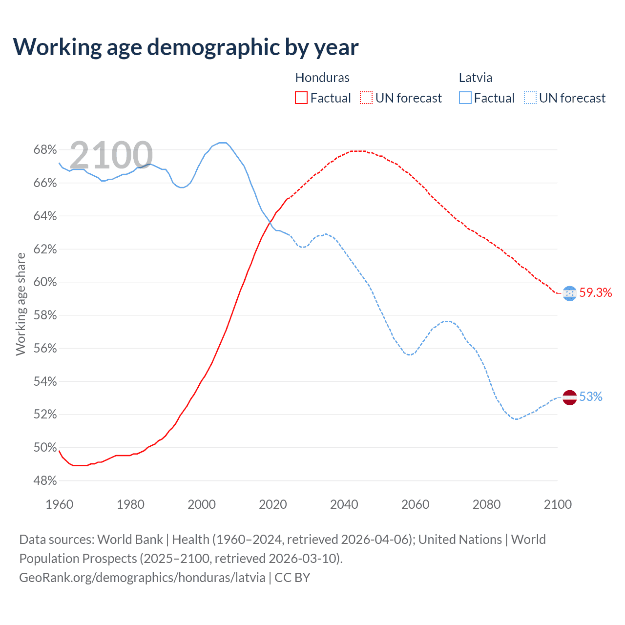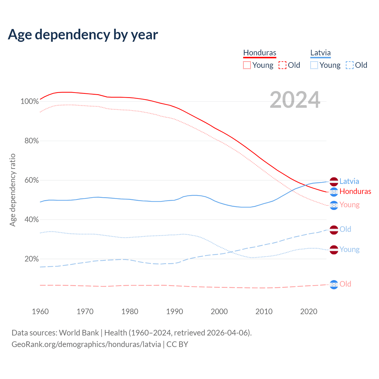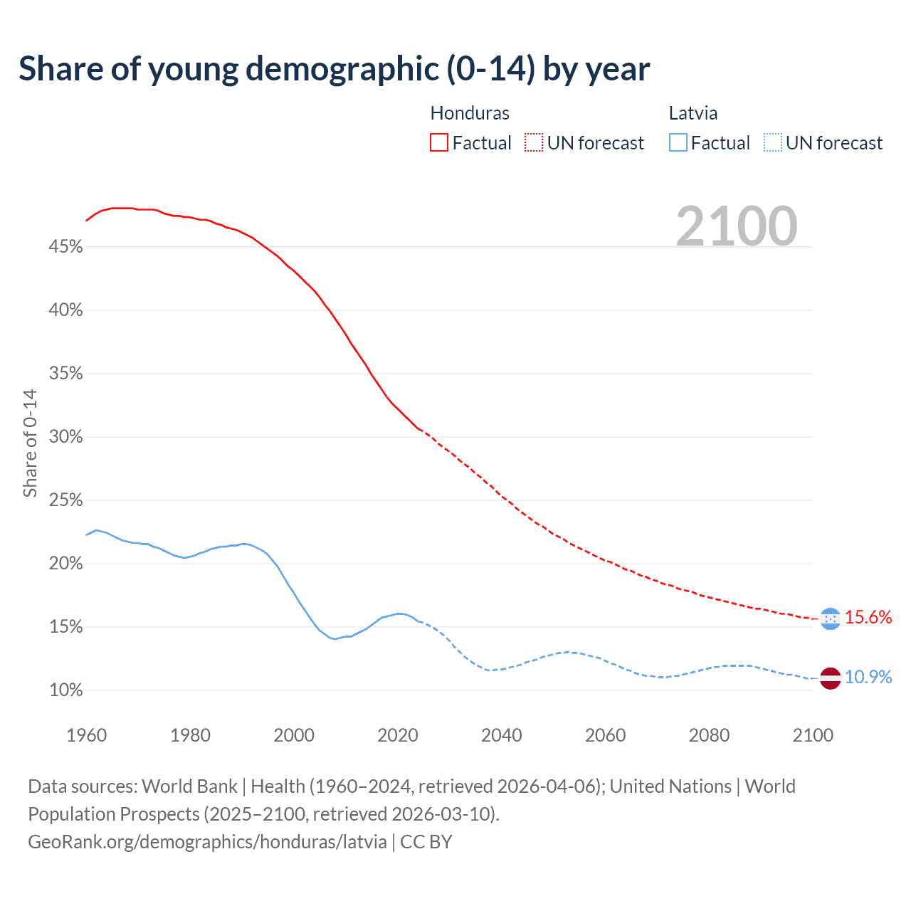 - The share of young demographic (0-15 years old) in Honduras is 30.6% vs 15.4% in Latvia.