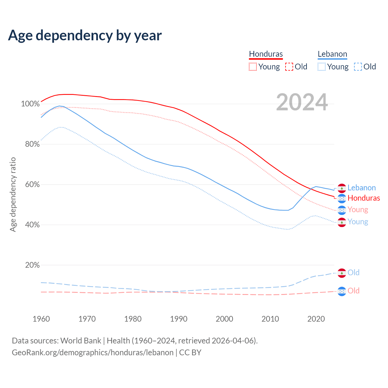 Data sources: World Bank | Health (1960–2024, retrieved 2026-04-06); U.S. Census Bureau (1960–2024, retrieved 2026-02-08).