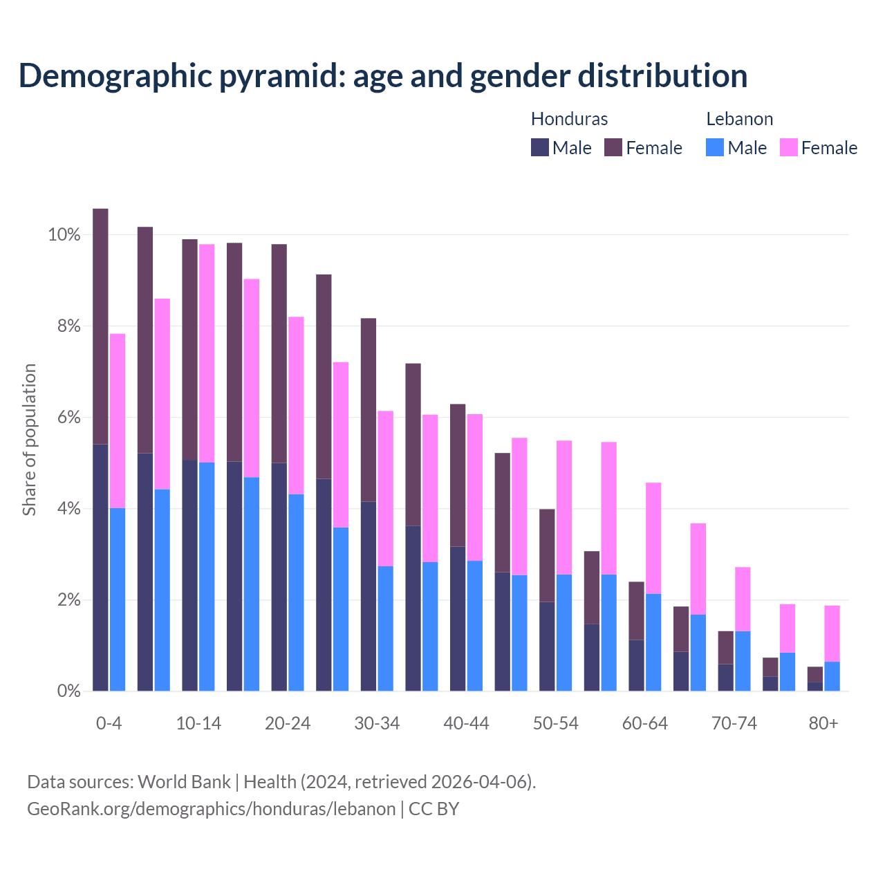 - The share of old-age demographic (65+) in Honduras is 4.42% vs 10.1% in Lebanon.