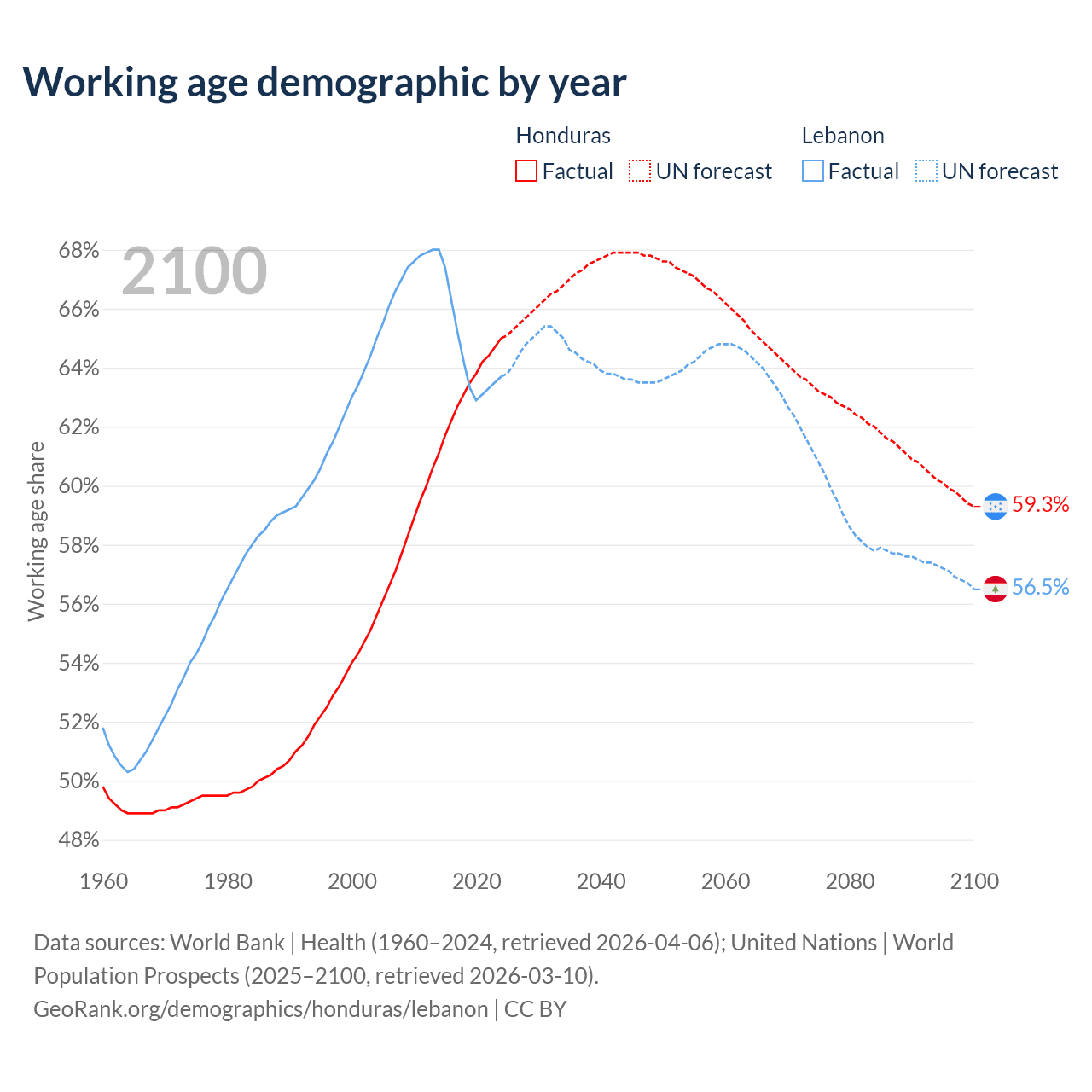 Median age Honduras vs Lebanon, 1960-2100