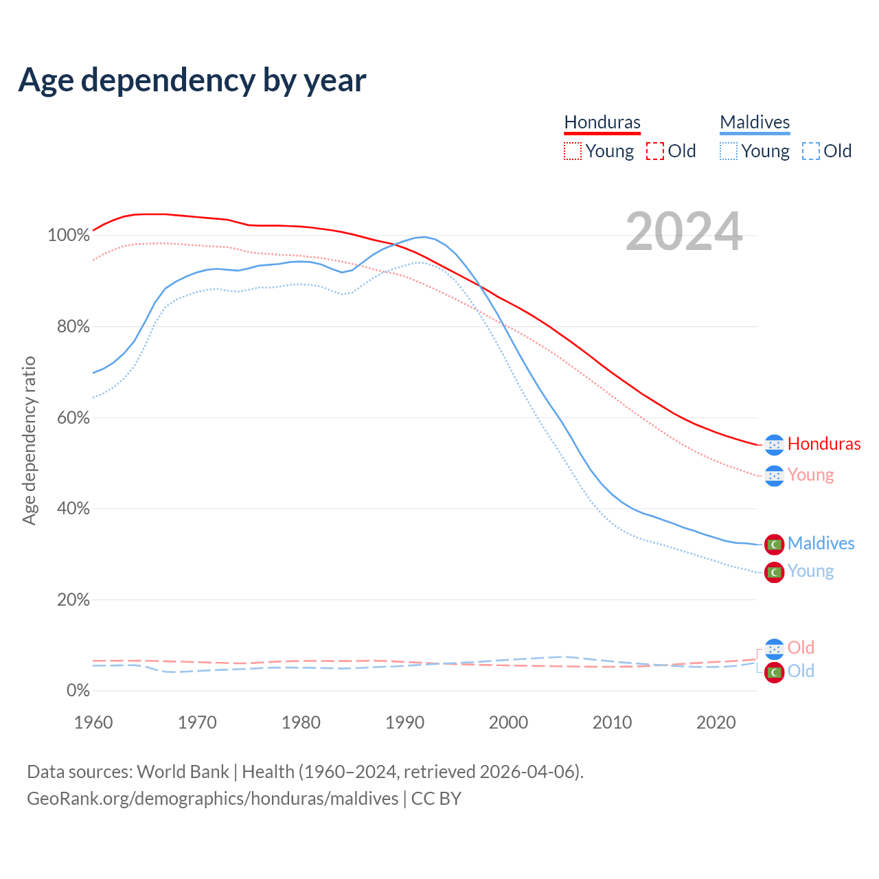 Data sources: World Bank | Health (1960–2024, retrieved 2026-04-06); U.S. Census Bureau (1960–2024, retrieved 2026-02-08).