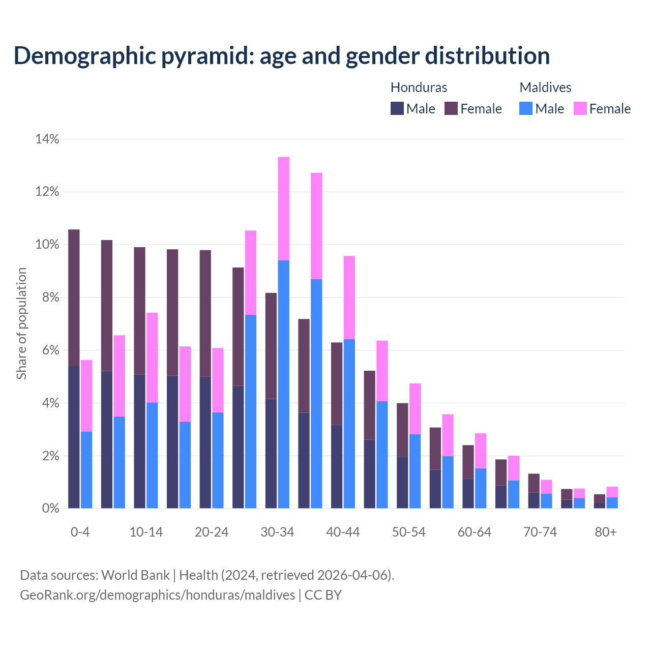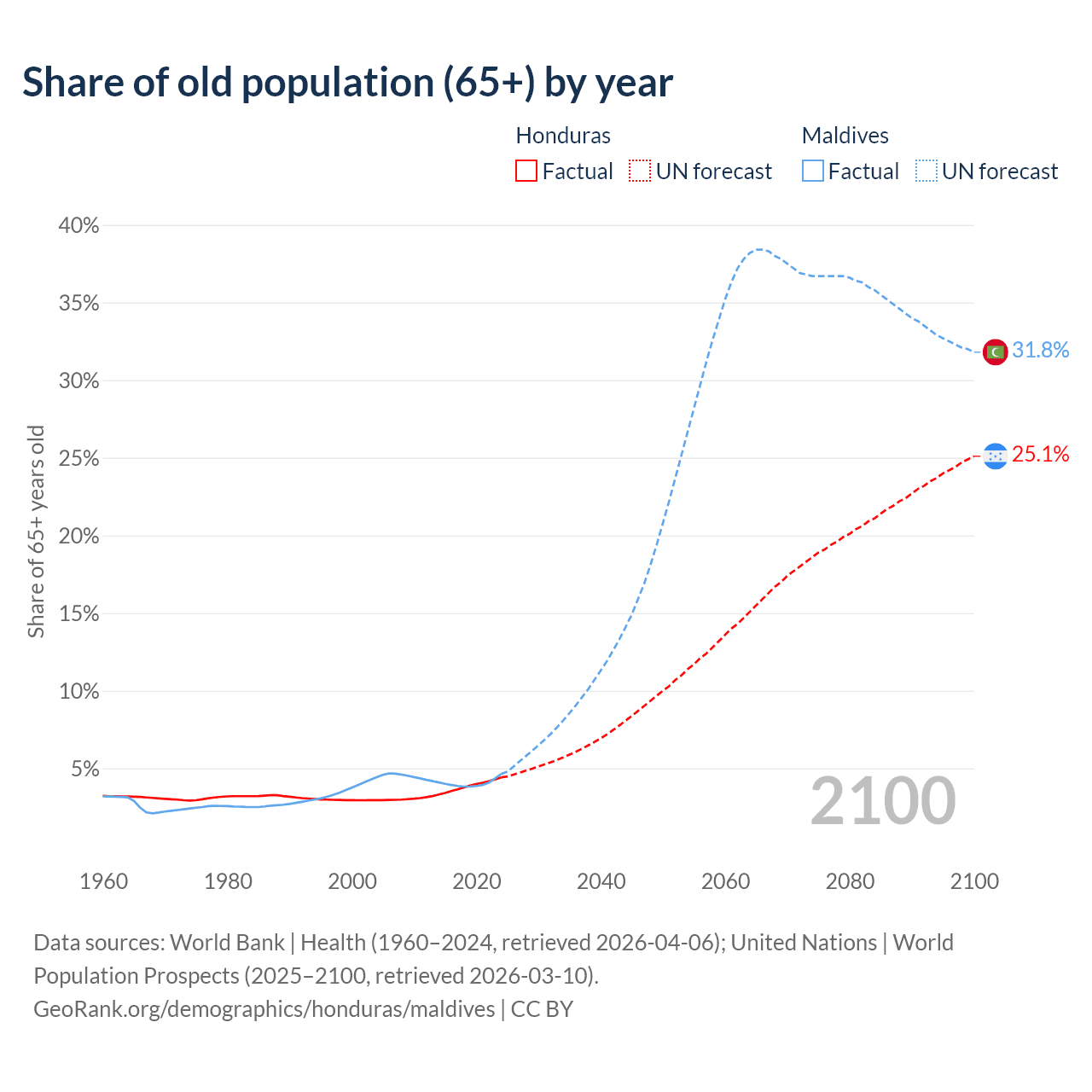 - The share of old-age demographic (65+) in Honduras is 4.42% vs 4.64% in Maldives.