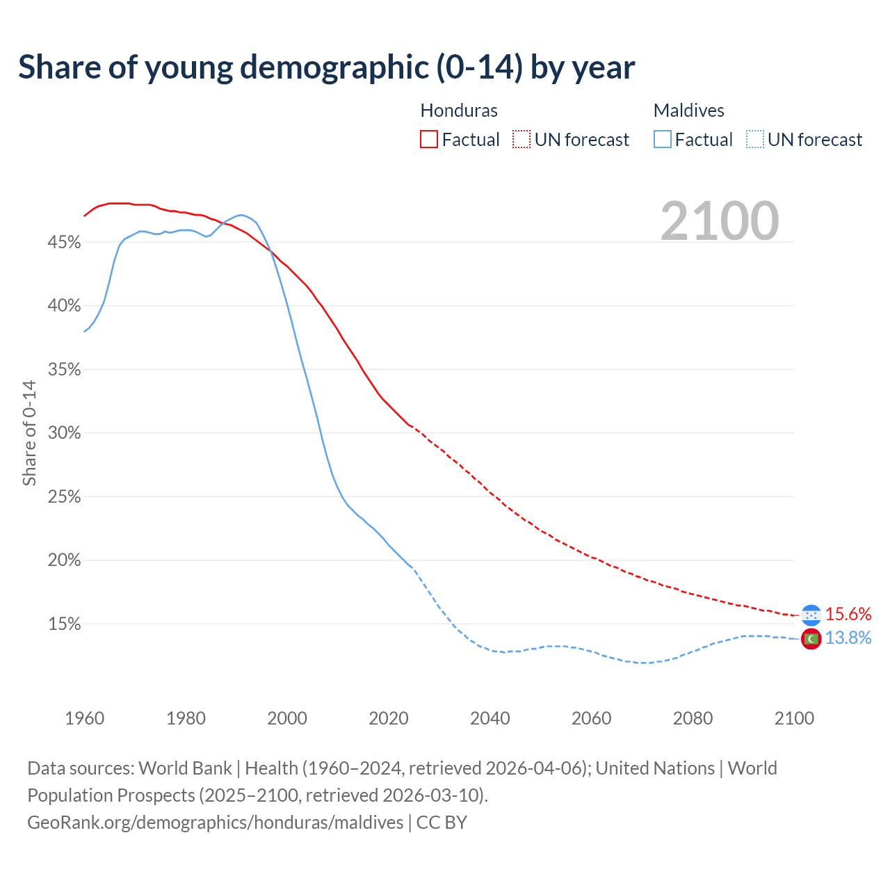 - The share of young demographic (0-15 years old) in Honduras is 30.6% vs 19.6% in Maldives.