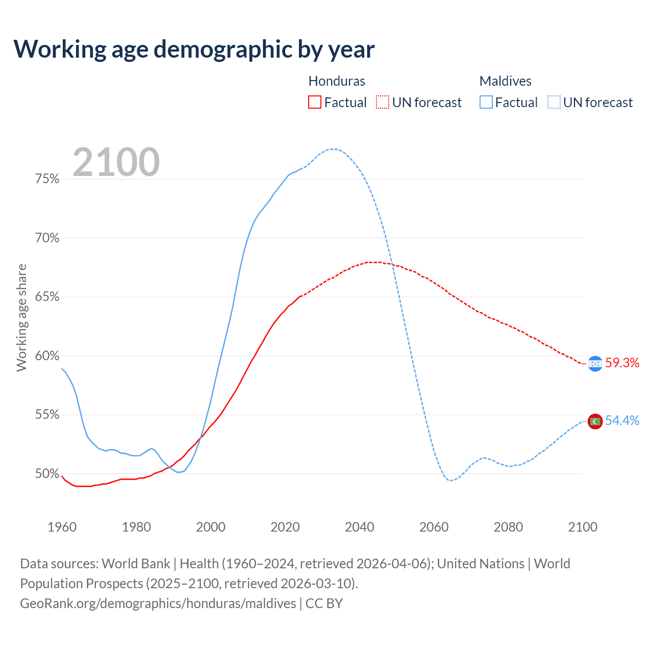 Median age Honduras vs Maldives, 1960-2100