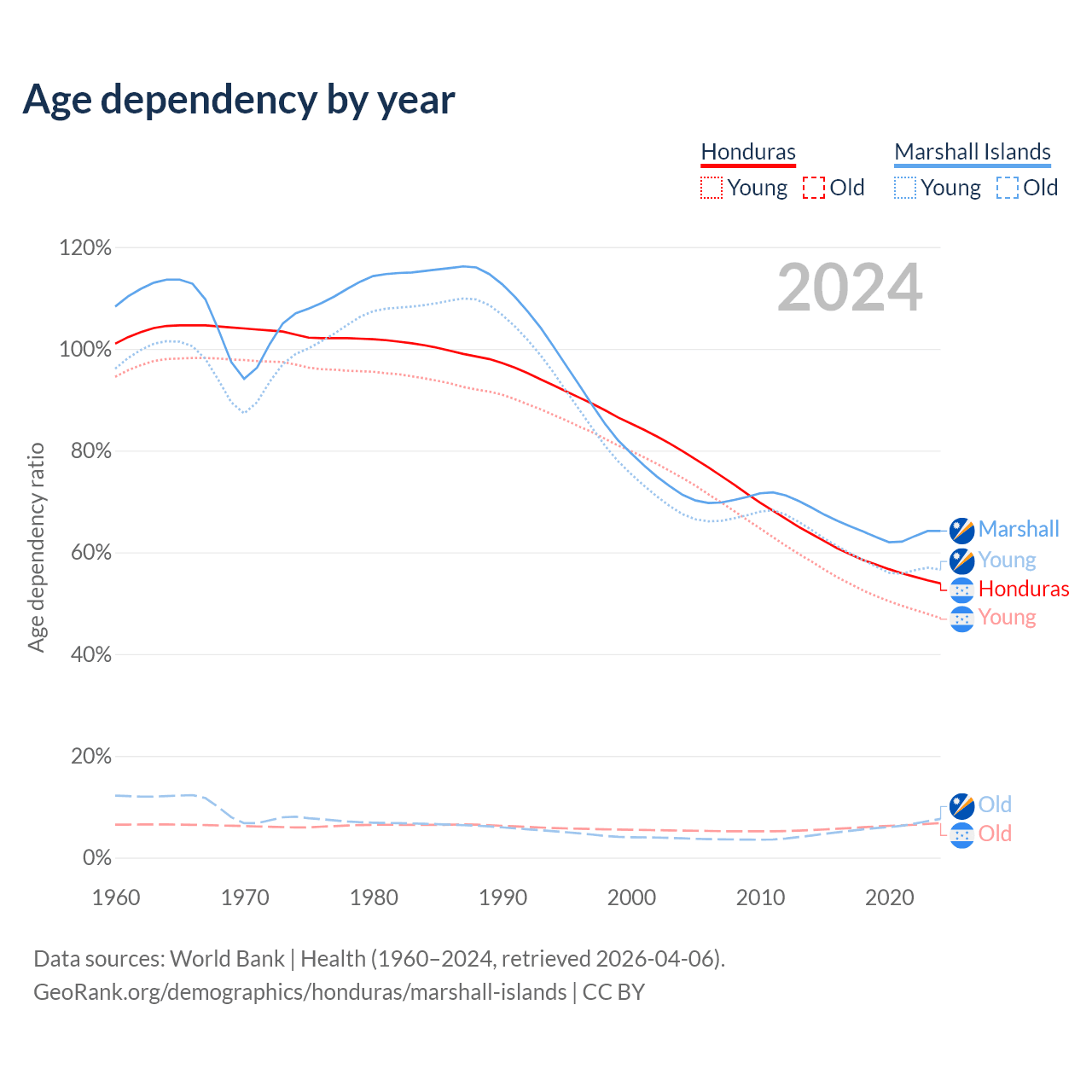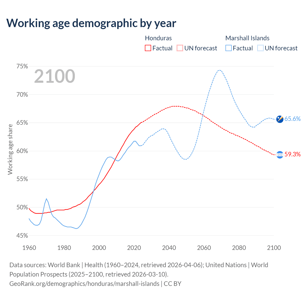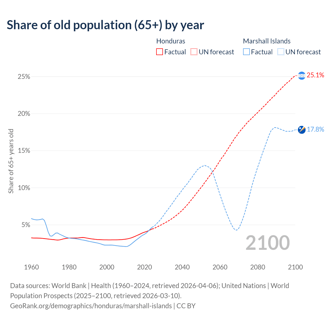 - The share of old-age demographic (65+) in Honduras is 4.42% vs 4.64% in the Marshall Islands.