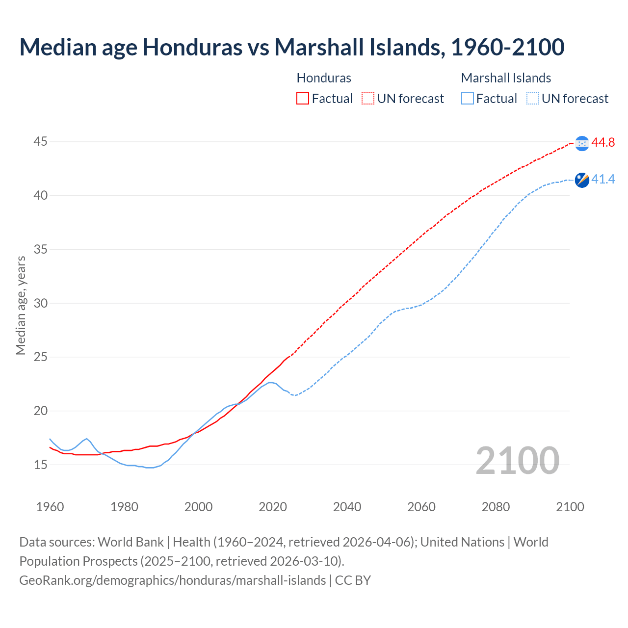 - Honduras is ranked 134/196 by median age (oldest to youngest) vs 150/196 for the Marshall Islands.