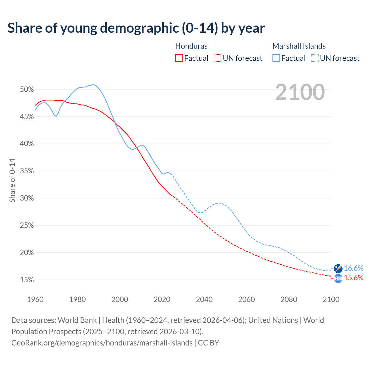 - The share of young demographic (0-15 years old) in Honduras is 30.6% vs 34.5% in the Marshall Islands.