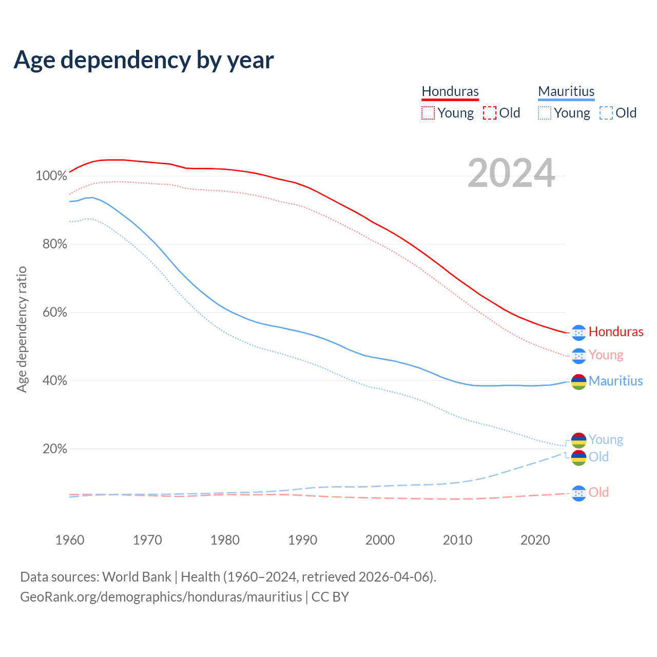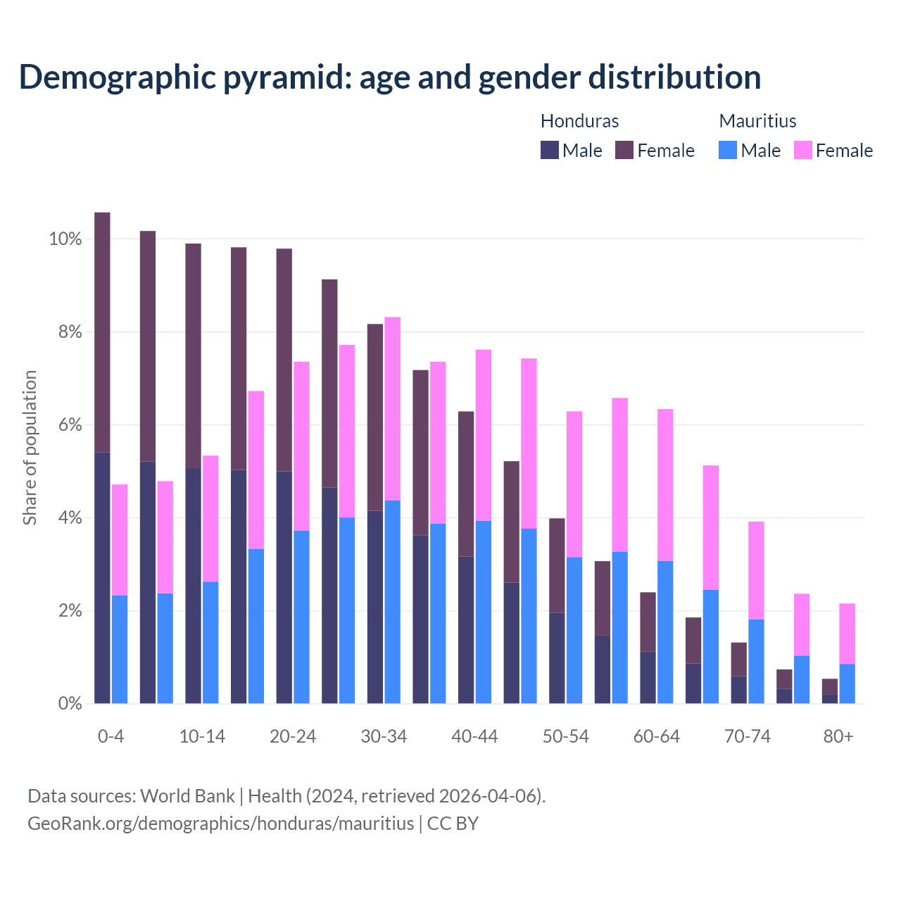 - Honduras is ranked 134/196 by median age (oldest to youngest) vs 57/196 for Mauritius.