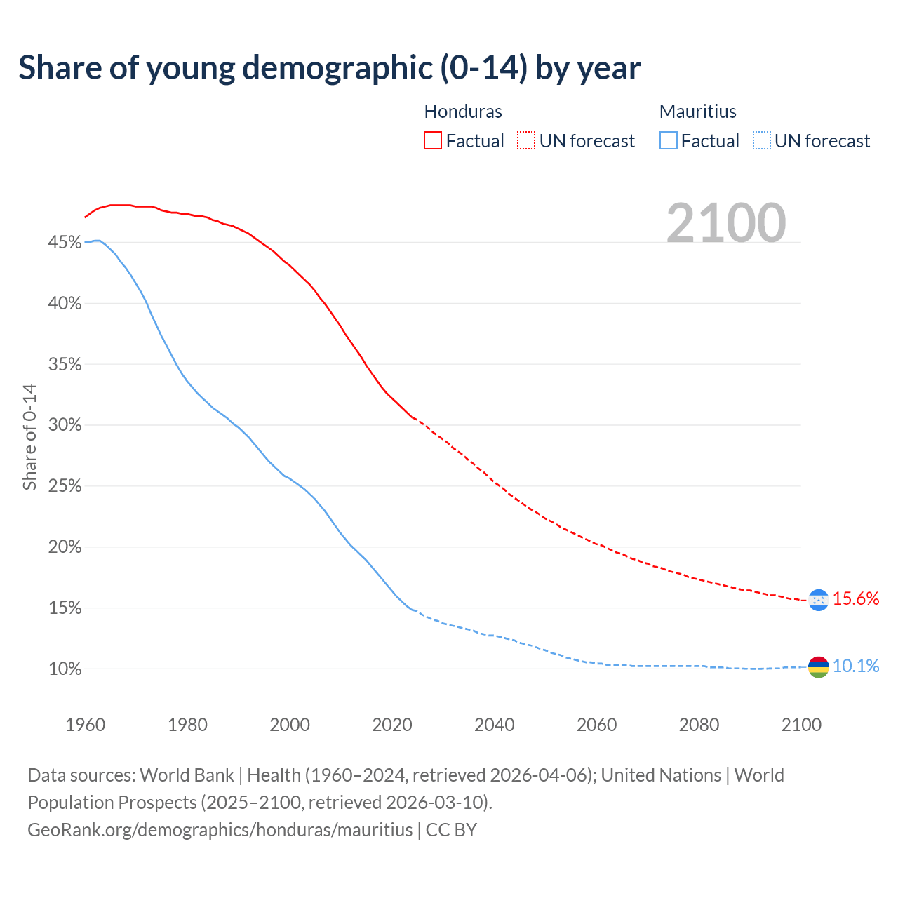 - The share of young demographic (0-15 years old) in Honduras is 30.6% vs 14.8% in Mauritius.