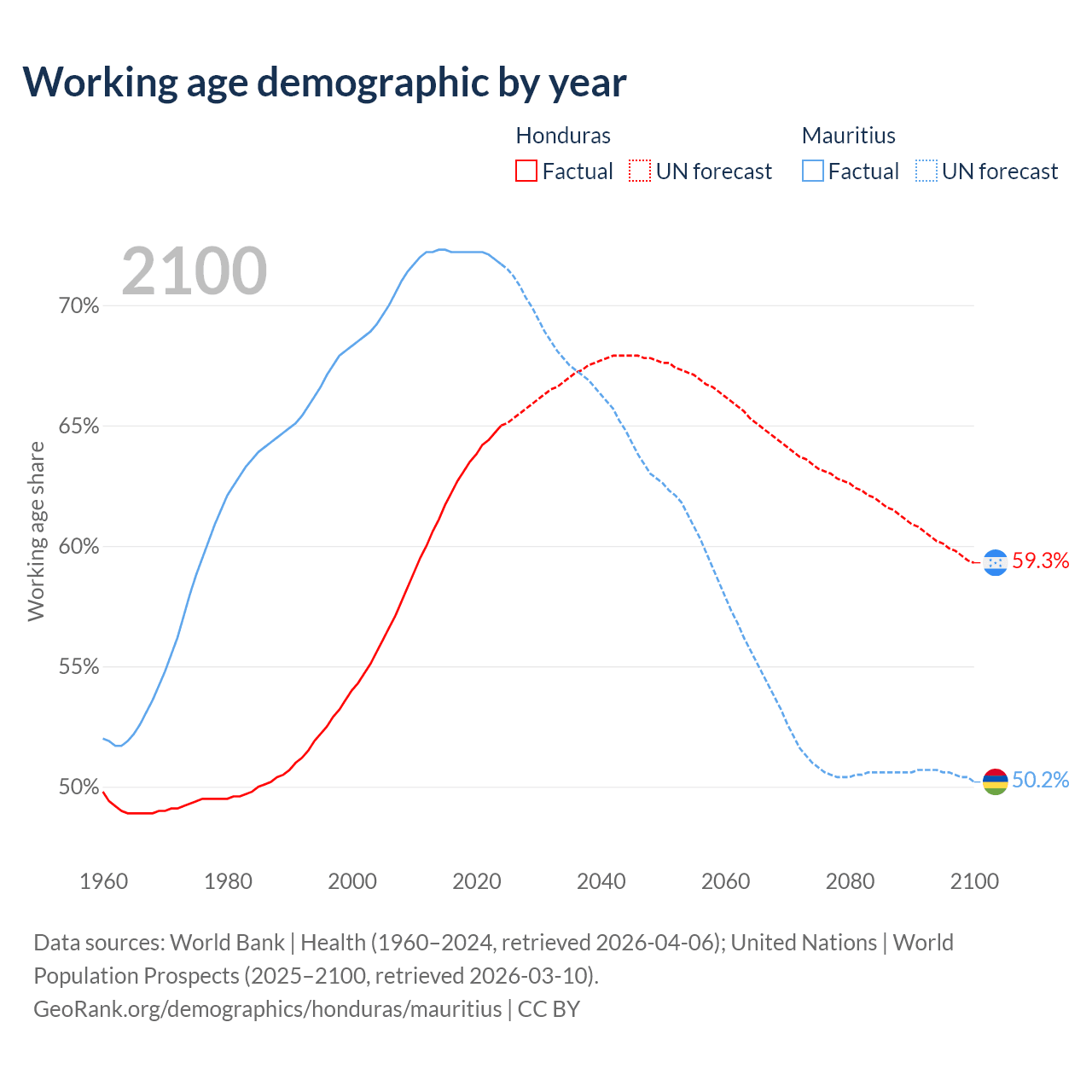 - Honduras has 7.3M working age adults (aged 15-64) vs 889K in Mauritius.