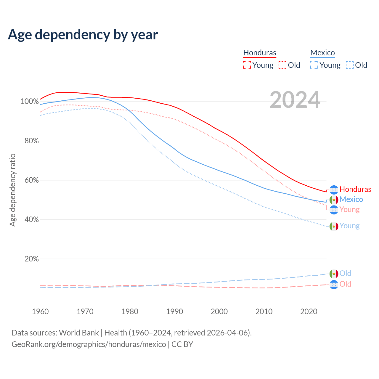 Data sources: World Bank | Health (1960–2024, retrieved 2026-04-06); U.S. Census Bureau (1960–2024, retrieved 2026-02-08).
