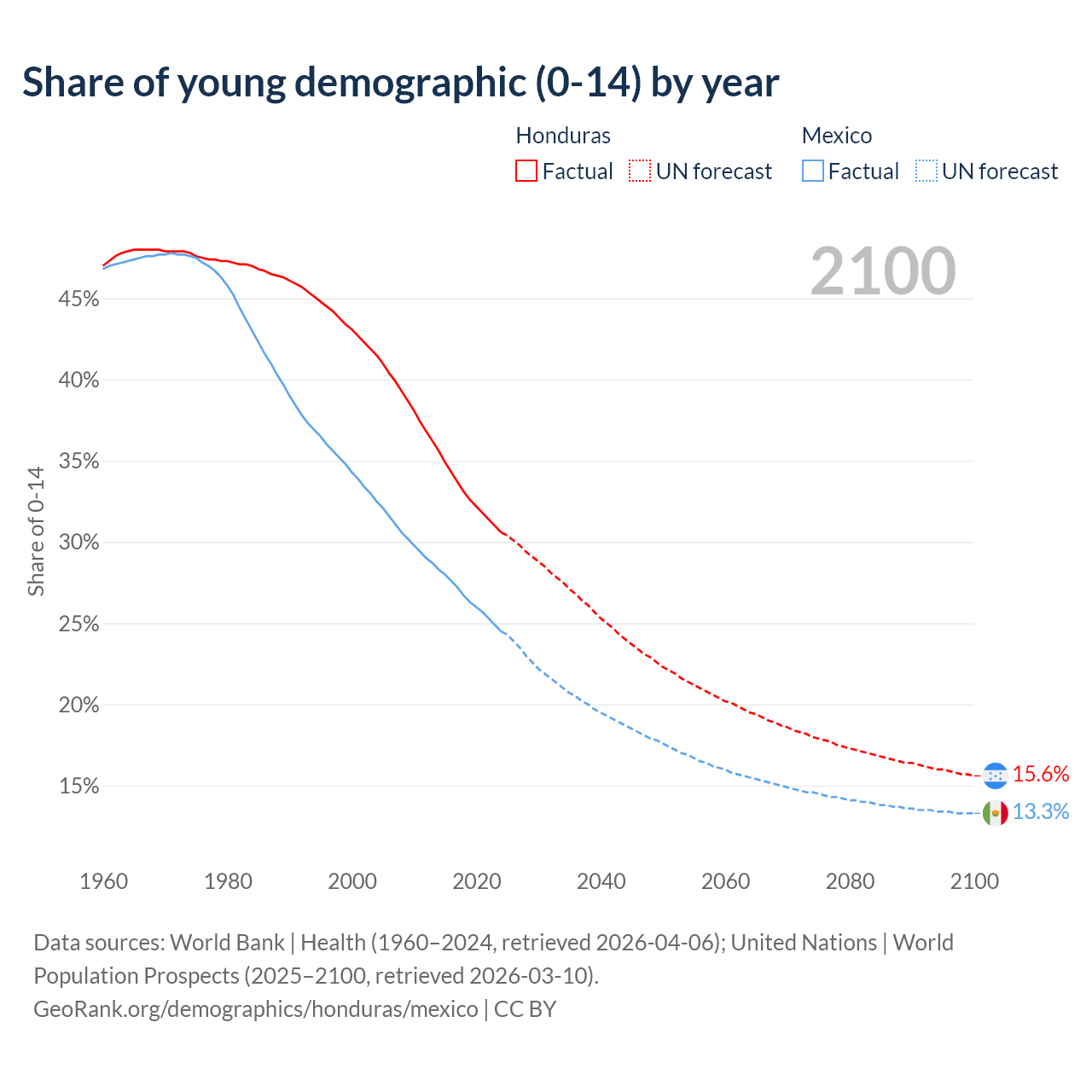 Median age Honduras vs Mexico, 1960-2100