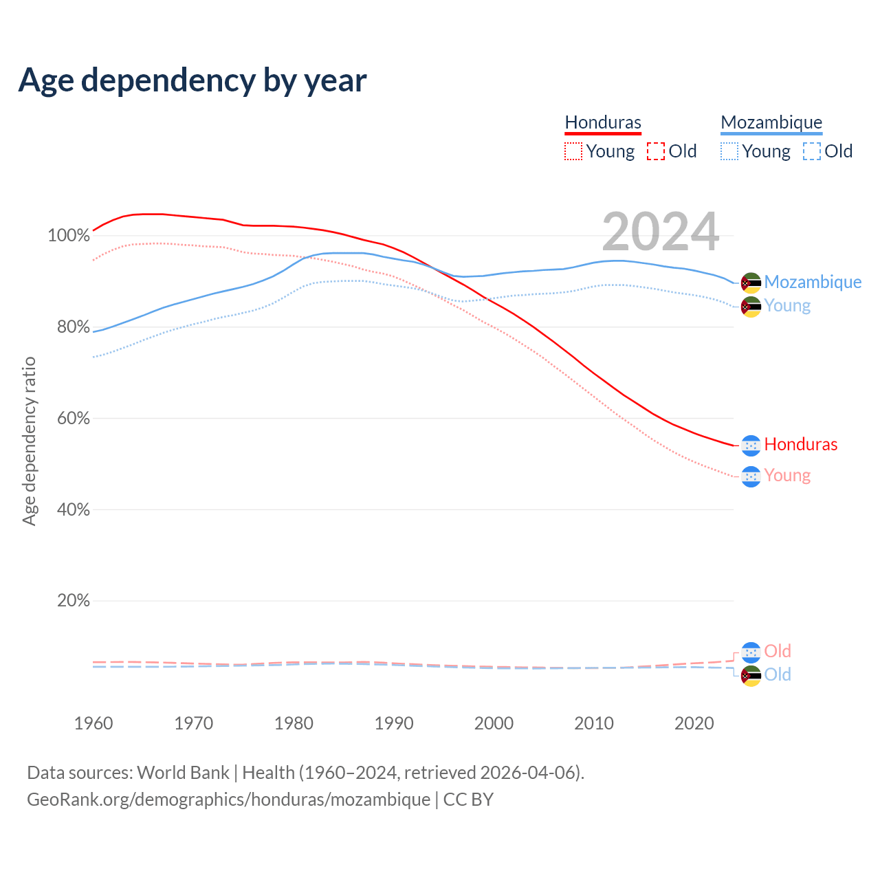 - Honduras is ranked 134/196 by median age (oldest to youngest) vs 189/196 for Mozambique.