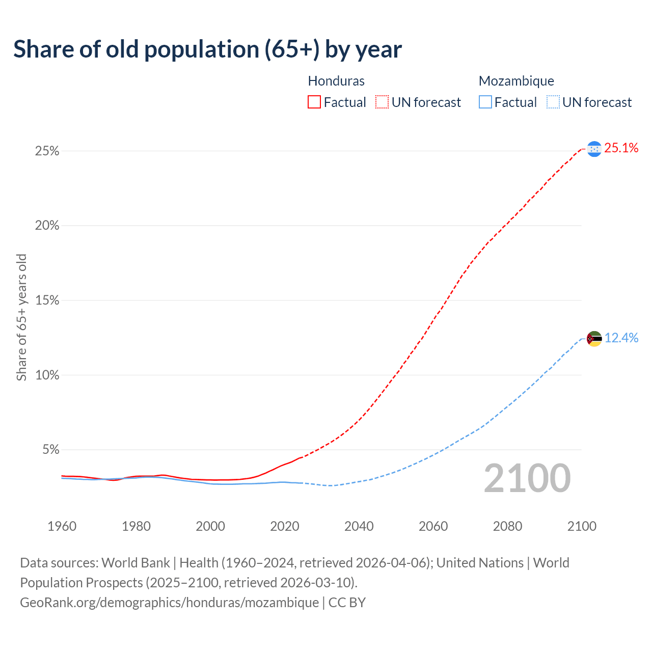 - The share of old-age demographic (65+) in Honduras is 4.42% vs 2.75% in Mozambique.