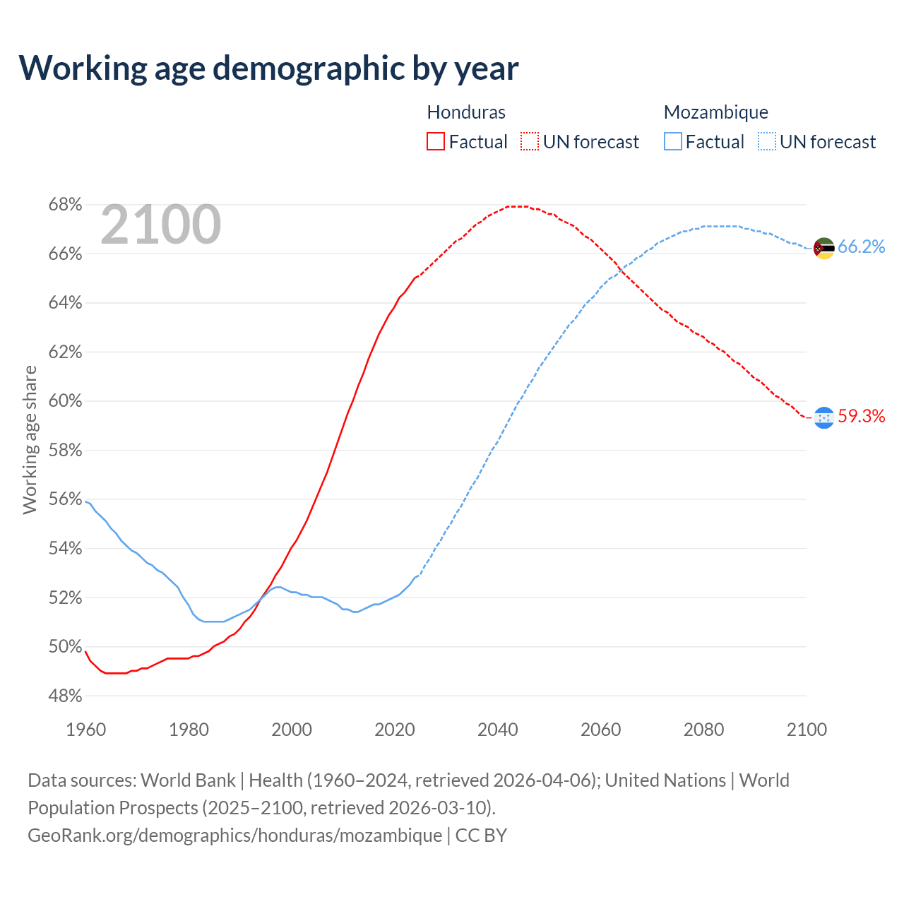 - Honduras has 7.3M working age adults (aged 15-64) vs 19.5M in Mozambique.