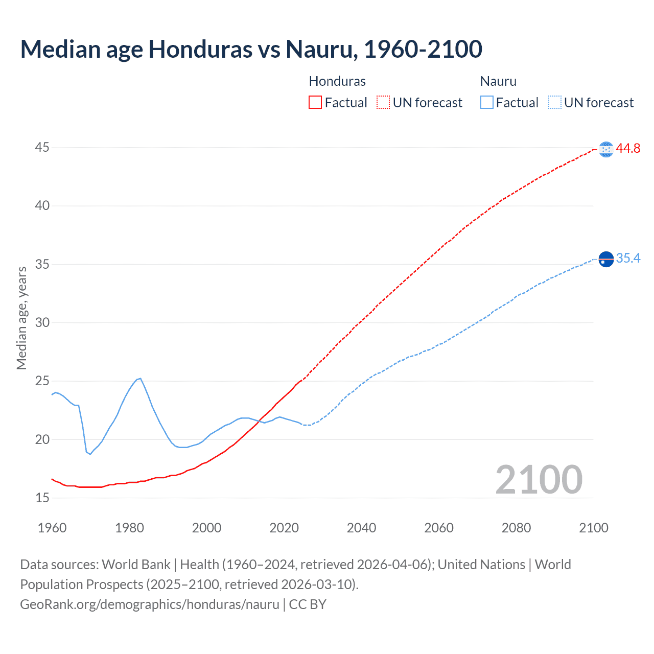 - Honduras is ranked 134/196 by median age (oldest to youngest) vs 155/196 for Nauru.