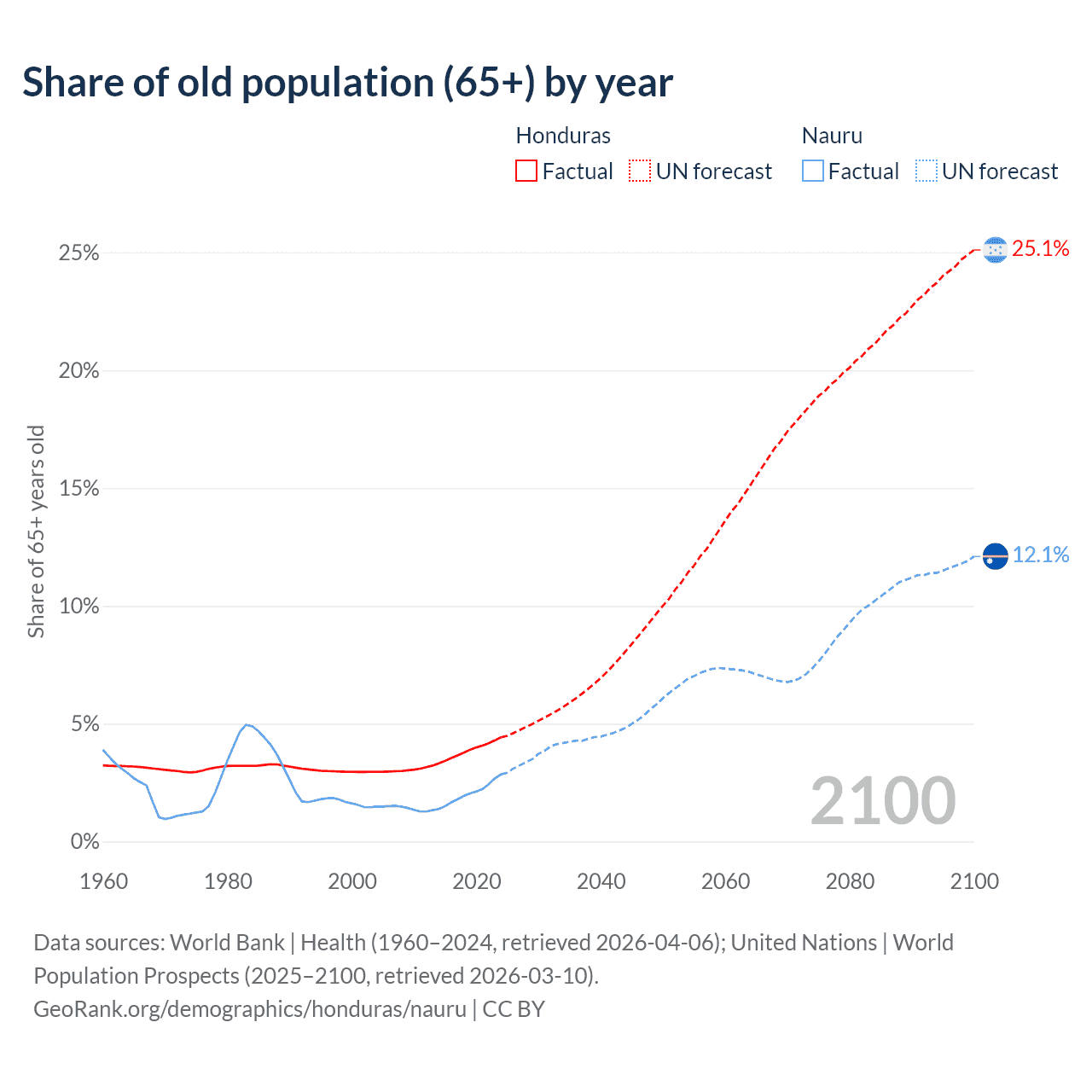 - The share of old-age demographic (65+) in Honduras is 4.42% vs 2.85% in Nauru.