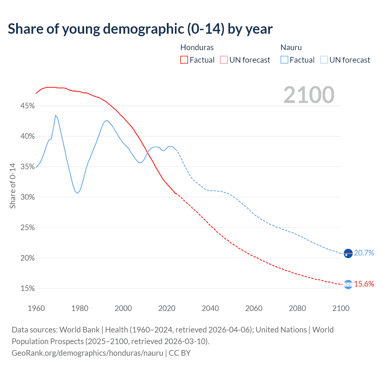 - The share of young demographic (0-15 years old) in Honduras is 30.6% vs 37.8% in Nauru.
