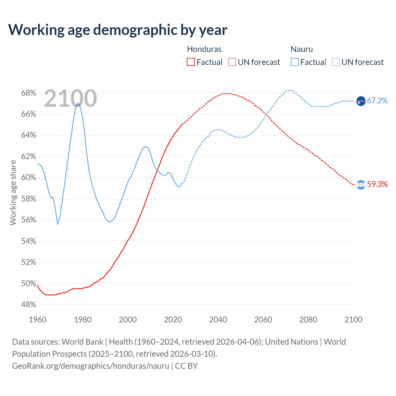 - Honduras has 7.3M working age adults (aged 15-64) vs 7.2K in Nauru.