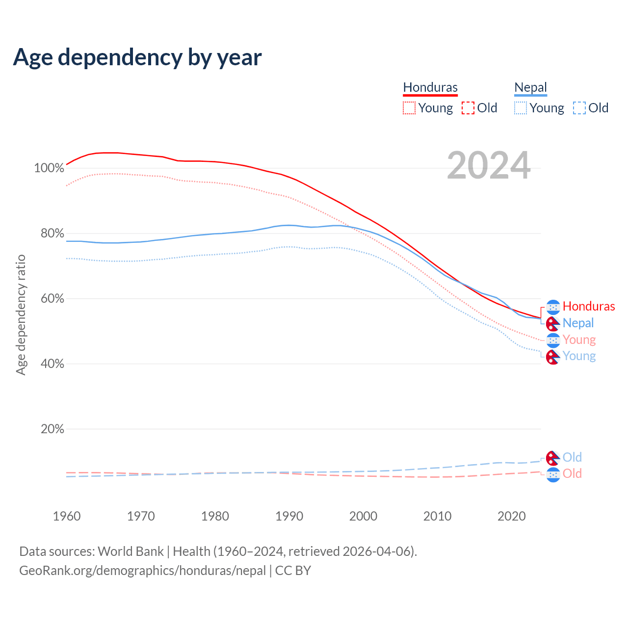 Data sources: World Bank | Health (1960–2024, retrieved 2026-04-06); U.S. Census Bureau (1960–2024, retrieved 2026-02-08).
