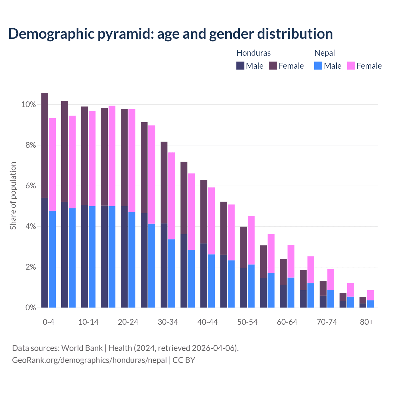 - The share of old-age demographic (65+) in Honduras is 4.42% vs 6.5% in Nepal.