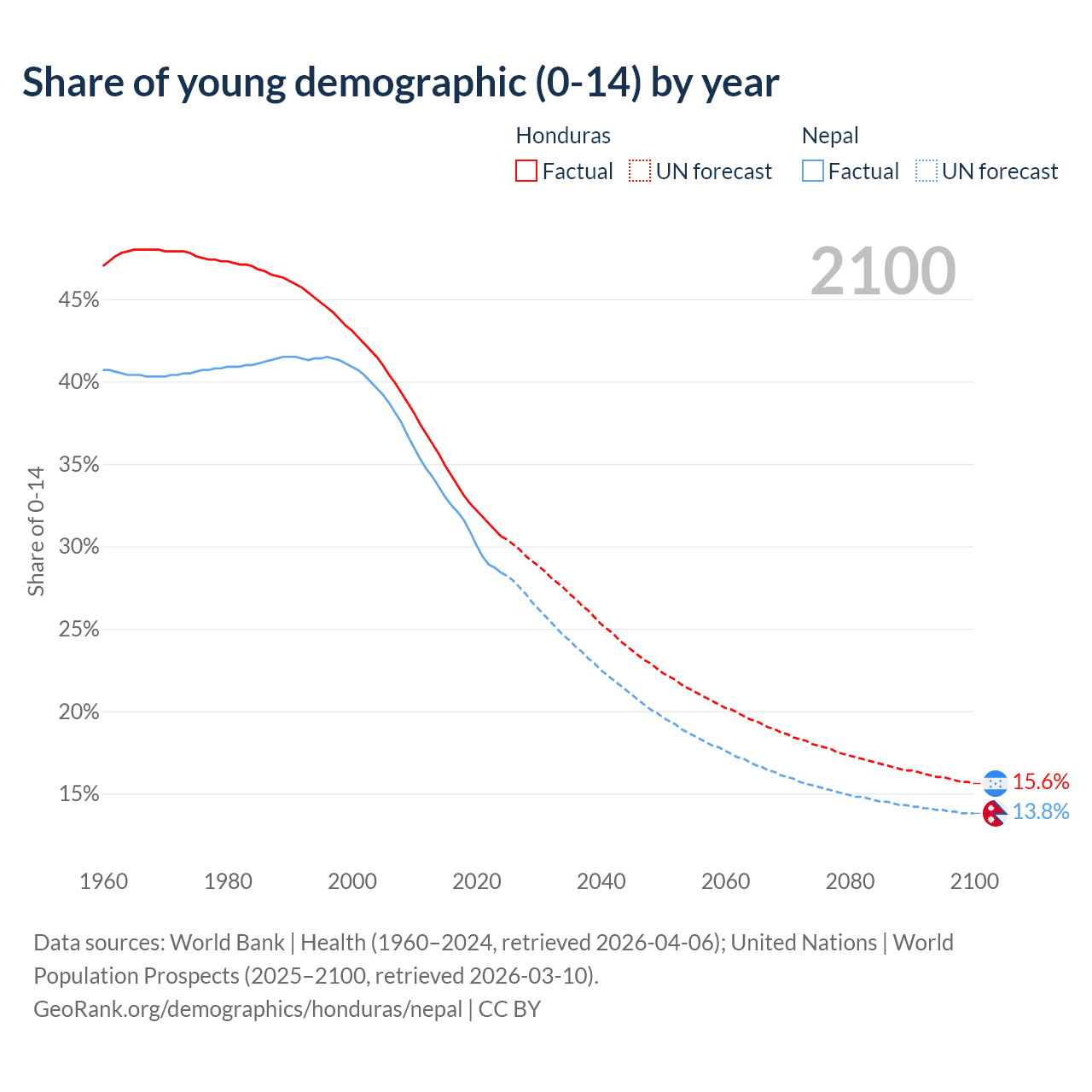- The share of young demographic (0-15 years old) in Honduras is 30.6% vs 28.4% in Nepal.