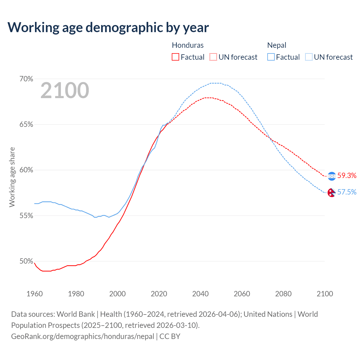 Median age Honduras vs Nepal, 1960-2100