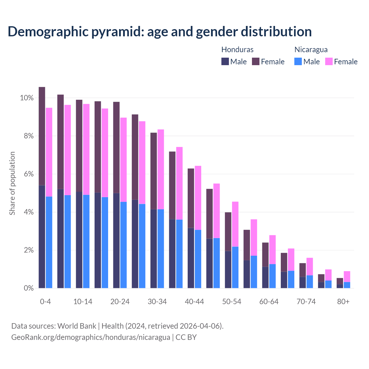 - Honduras is ranked 134/196 by median age (oldest to youngest) vs 125/196 for Nicaragua.