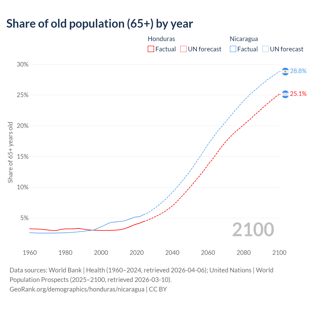 The share of older people aged 65 and over is 4.42% in Honduras and 5.53% in Nicaragua. Life expectancy in Honduras compared to Nicaragua .